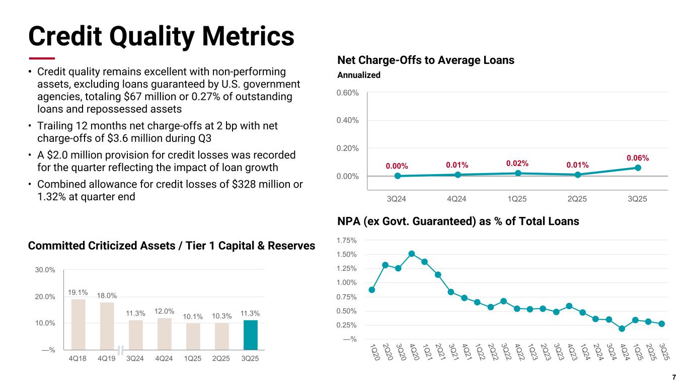 Pri m ar y & se co nd ar y br an d co lor s Data viz colors Data viz monochromatic Loan Portfolio • Combined Services & General Business (Core C&I) balances increased $112 million or 1.4% linked quarter • Energy balances decreased $53 million as we continued to see elevated payoff activity in this portfolio • Healthcare balances increased $70 million linked quarter, reflecting strong origination activity, particularly in the senior housing space • Commercial Real Estate loan balances grew $231 million or 4.2% linked quarter with growth covering multifamily, industrial, office, retail, and construction 6 ($Million) Sep. 30, 2025 June 30, 2025 Sep. 30, 2024 Seq. Loan Growth YOY Loan Growth Energy $ 2,681.5 $ 2,734.7 $ 3,126.6 (1.9)% (14.2)% Services 3,710.6 3,658.8 3,573.7 1.4% 3.8% Healthcare 3,878.5 3,808.9 4,149.1 1.8% (6.5)% General Business 4,242.2 4,181.7 4,028.5 1.4% 5.3% Total Commercial $ 14,512.9 $ 14,384.2 $ 14,877.9 0.9% (2.5)% Multifamily $ 2,500.3 $ 2,473.4 $ 2,109.4 1.1% 18.5% Industrial 1,396.8 1,304.2 1,270.9 7.1% 9.9% Office 811.6 690.1 816.0 17.6% (0.5)% Retail 593.8 592.0 521.9 0.3% 13.8% Residential Construction and Land Development 122.0 105.7 105.0 15.5% 16.2% Other Commercial Real Estate 328.0 356.0 365.4 (7.9)% (10.2)% Total Commercial Real Estate $ 5,752.6 $ 5,521.4 $ 5,188.7 4.2% 10.9% Loans to individuals $ 4,599.6 $ 4,386.6 $ 3,918.5 4.9% 17.4% Total Loans $ 24,865.2 $ 24,292.2 $ 23,985.1 2.4% 3.7%