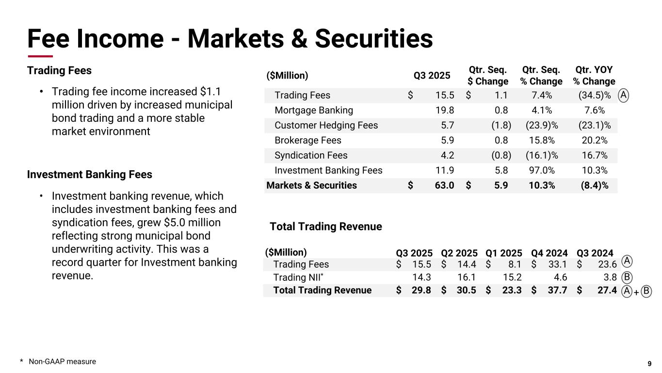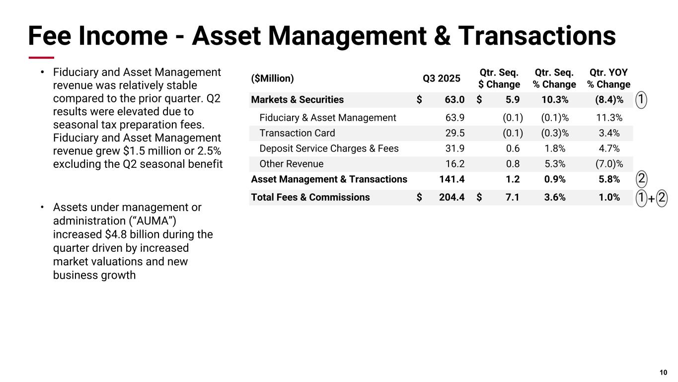 Pri m ar y & se co nd ar y br an d co lor s Data viz colors Data viz monochromatic Fee Income - Markets & Securities Trading Fees • Trading fee income increased $1.1 million driven by increased municipal bond trading and a more stable market environment Investment Banking Fees • Investment banking revenue, which includes investment banking fees and syndication fees, grew $5.0 million reflecting strong municipal bond underwriting activity. This was a record quarter for Investment banking revenue. 9 ($Million) Q3 2025 Qtr. Seq. $ Change Qtr. Seq. % Change Qtr. YOY % Change Trading Fees $ 15.5 $ 1.1 7.4% (34.5)% Mortgage Banking 19.8 0.8 4.1% 7.6% Customer Hedging Fees 5.7 (1.8) (23.9)% (23.1)% Brokerage Fees 5.9 0.8 15.8% 20.2% Syndication Fees 4.2 (0.8) (16.1)% 16.7% Investment Banking Fees 11.9 5.8 97.0% 10.3% Markets & Securities $ 63.0 $ 5.9 10.3% (8.4)% ($Million) Q3 2025 Q2 2025 Q1 2025 Q4 2024 Q3 2024 Trading Fees $ 15.5 $ 14.4 $ 8.1 $ 33.1 $ 23.6 Trading NII* 14.3 16.1 15.2 4.6 3.8 Total Trading Revenue $ 29.8 $ 30.5 $ 23.3 $ 37.7 $ 27.4 A A Total Trading Revenue A + B B * Non-GAAP measure