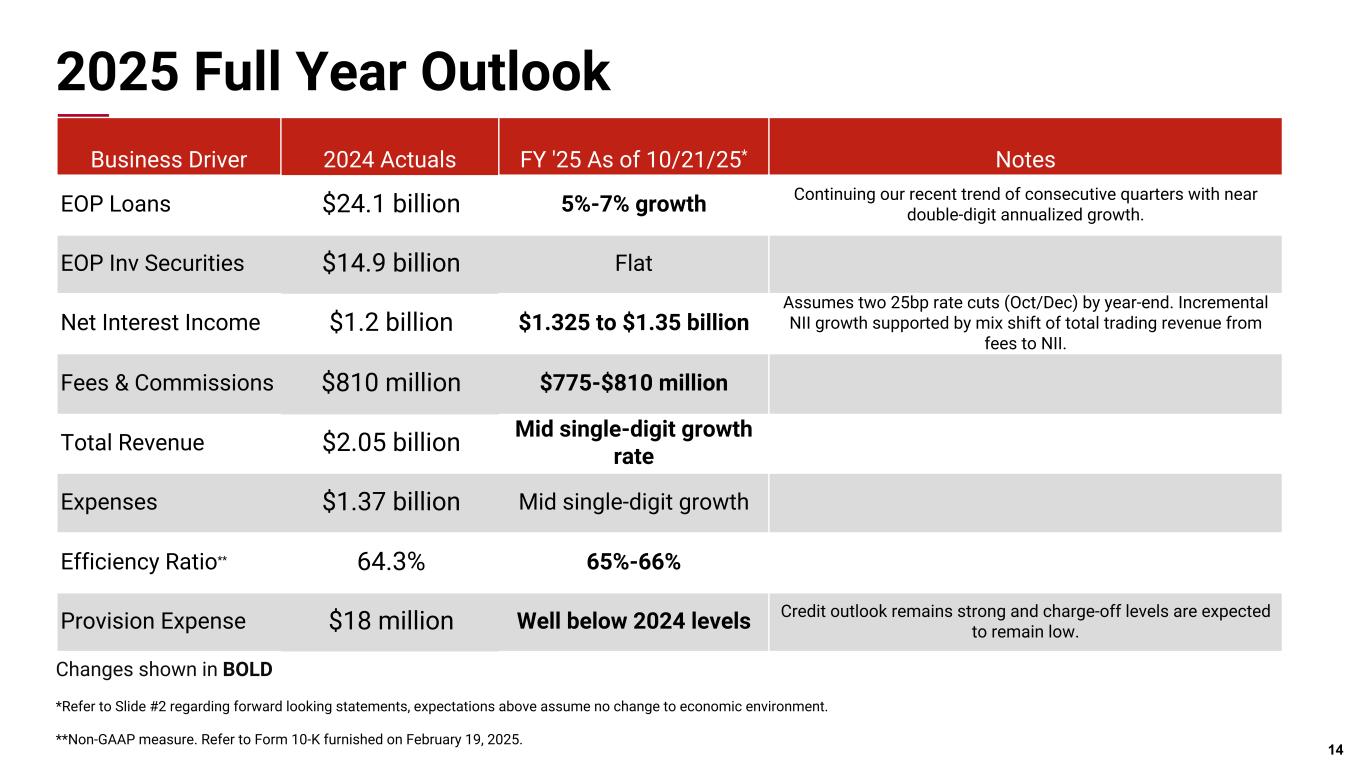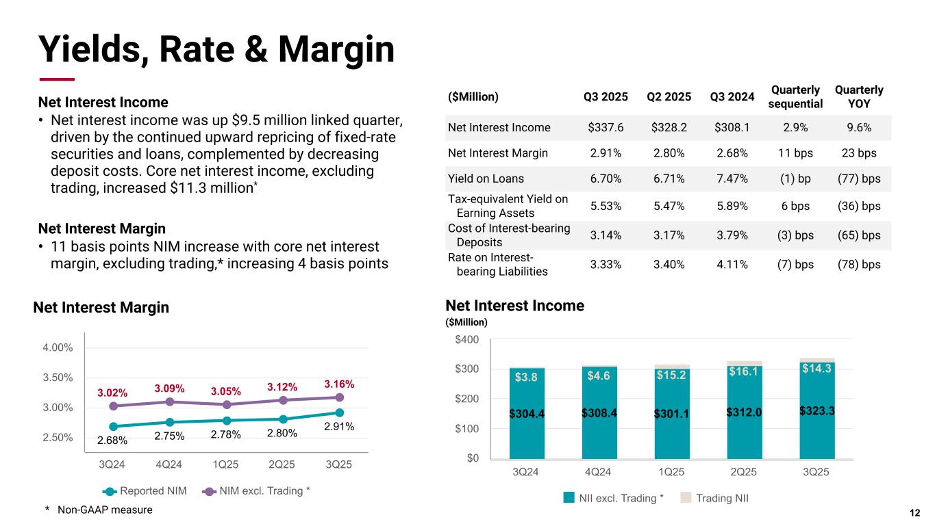 Pri m ar y & se co nd ar y br an d co lor s Data viz colors Data viz monochromatic Yields, Rate & Margin Net Interest Income • Net interest income was up $9.5 million linked quarter, driven by the continued upward repricing of fixed-rate securities and loans, complemented by decreasing deposit costs. Core net interest income, excluding trading, increased $11.3 million* Net Interest Margin • 11 basis points NIM increase with core net interest margin, excluding trading,* increasing 4 basis points 12 ($Million) Q3 2025 Q2 2025 Q3 2024 Quarterly sequential Quarterly YOY Net Interest Income $337.6 $328.2 $308.1 2.9% 9.6% Net Interest Margin 2.91% 2.80% 2.68% 11 bps 23 bps Yield on Loans 6.70% 6.71% 7.47% (1) bp (77) bps Tax-equivalent Yield on Earning Assets 5.53% 5.47% 5.89% 6 bps (36) bps Cost of Interest-bearing Deposits 3.14% 3.17% 3.79% (3) bps (65) bps Rate on Interest- bearing Liabilities 3.33% 3.40% 4.11% (7) bps (78) bps Net Interest Income ($Million) $304.4 $308.4 $301.1 $312.0 $323.3 $3.8 $4.6 $15.2 $16.1 $14.3 NII excl. Trading * Trading NII 3Q24 4Q24 1Q25 2Q25 3Q25 $0 $100 $200 $300 $400 2.68% 2.75% 2.78% 2.80% 2.91% 3.02% 3.09% 3.05% 3.12% 3.16% Reported NIM NIM excl. Trading * 3Q24 4Q24 1Q25 2Q25 3Q25 2.50% 3.00% 3.50% 4.00% Net Interest Margin * Non-GAAP measure
