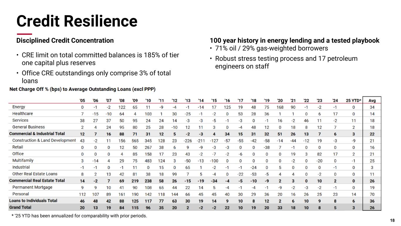 Pri m ar y & se co nd ar y br an d co lor s Data viz colors Data viz monochromatic Credit Resilience Disciplined Credit Concentration • CRE limit on total committed balances is 185% of tier one capital plus reserves • Office CRE outstandings only comprise 3% of total loans 18 100 year history in energy lending and a tested playbook • 71% oil / 29% gas-weighted borrowers • Robust stress testing process and 17 petroleum engineers on staff * '25 YTD has been annualized for comparability with prior periods.
