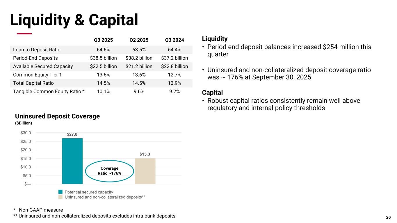 Pri m ar y & se co nd ar y br an d co lor s Data viz colors Data viz monochromatic Securities and Interest Rate Risk Position Interest Rate Risk • Approximately 75% of the total loan portfolio is variable rate or fixed rate that reprice within a year • Approximately 84% of Commercial and Commercial Real Estate portfolios are variable rate or fixed rate that reprice within a year • Sensitivity to betas - The impact of decreasing our deposit beta by 10% in a down -100 interest rate scenario is 0.22% on NII 19 Scenario* Δ NII % Δ NII $ Down 200 Ramp, year 1 1.96% $27.3 million Down 100 Ramp, year 1 0.84% $11.7 million Up 100 Ramp, year 1 (1.07)% $(14.9) million Up 200 Ramp, year 1 (2.63)% $(36.5) million Securities Portfolio • Short duration with limited extension, current portfolio duration is 3.0 years, extending to only 3.4 years if rates increase 200 bps • RMBS portfolio is all "AAA" rated with average credit enhancement of ~18% • Portfolio runoff for Q3 2025 was $605 million 93% 5% 2% Govt/GSE Guaranteed RMBS Muni BOKF Securities by Guarantee Type 09/30/2025