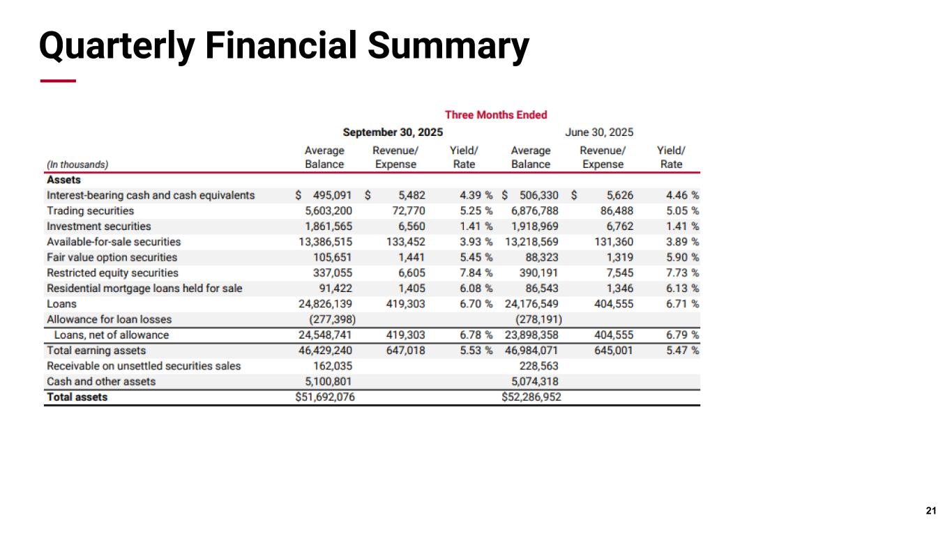 Pri m ar y & se co nd ar y br an d co lor s Data viz colors Data viz monochromatic Liquidity & Capital * Non-GAAP measure ** Uninsured and non-collateralized deposits excludes intra-bank deposits Liquidity • Period end deposit balances increased $254 million this quarter • Uninsured and non-collateralized deposit coverage ratio was ~ 176% at September 30, 2025 Capital • Robust capital ratios consistently remain well above regulatory and internal policy thresholds 20 Q3 2025 Q2 2025 Q3 2024 Loan to Deposit Ratio 64.6% 63.5% 64.4% Period-End Deposits $38.5 billion $38.2 billion $37.2 billion Available Secured Capacity $22.5 billion $21.2 billion $22.8 billion Common Equity Tier 1 13.6% 13.6% 12.7% Total Capital Ratio 14.5% 14.5% 13.9% Tangible Common Equity Ratio * 10.1% 9.6% 9.2% $27.0 $15.3 Potential secured capacity Uninsured and non-collateralized deposits** $— $5.0 $10.0 $15.0 $20.0 $25.0 $30.0 Coverage Ratio ~176% Uninsured Deposit Coverage ($Billion)