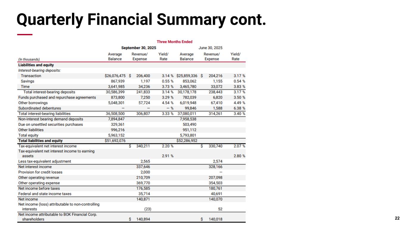 Pri m ar y & se co nd ar y br an d co lor s Data viz colors Data viz monochromatic This presentation contains forward-looking statements that are based on management's beliefs, assumptions, current expectations, estimates and projections about BOK Financial Corporation, the financial services industry, and the economy generally. Words such as “anticipates,” “believes,” “estimates,” “expects,” “forecasts,” “plans,” "outlook," “projects,” “will,” “intends,” variations of such words and similar expressions are intended to identify such forward-looking statements. Management judgments relating to and discussion of the provision and allowance for credit losses, allowance for uncertain tax positions, accruals for loss contingencies and valuation of mortgage servicing rights involve judgments as to expected events and are inherently forward-looking statements. Assessments that acquisitions and growth endeavors will be profitable are necessary statements of belief as to the outcome of future events based in part on information provided by others which BOK Financial has not independently verified. These various forward-looking statements are not guarantees of future performance and involve certain risks, uncertainties, and assumptions which are difficult to predict with regard to timing, extent, likelihood and degree of occurrence. Therefore, actual results and outcomes may materially differ from what is expected, implied or forecasted in such forward-looking statements. Internal and external factors that might cause such a difference include, but are not limited to changes in government, changes in governmental economic policy, including tariffs, changes in commodity prices, interest rates and interest rate relationships, inflation, demand for products and services, the degree of competition by traditional and nontraditional competitors, changes in banking regulations, tax laws, prices, levies and assessments, the impact of technological advances, and trends in customer behavior as well as their ability to repay loans. For a discussion of risk factors that may cause actual results to differ from expectations, please refer to BOK Financial Corporation’s most recent annual and quarterly reports. BOK Financial Corporation and its affiliates undertake no obligation to update, amend, or clarify forward-looking statements, whether as a result of new information, future events, or otherwise. Non-GAAP Financial Measures: This presentation may refer to non-GAAP financial measures. Additional information on these financial measures is available in BOK Financial’s Form 8-K filings furnished pursuant to Item 2.02, which can be accessed at bokf.com. All data is presented as of September 30, 2025 unless otherwise noted. Legal Disclaimers 2