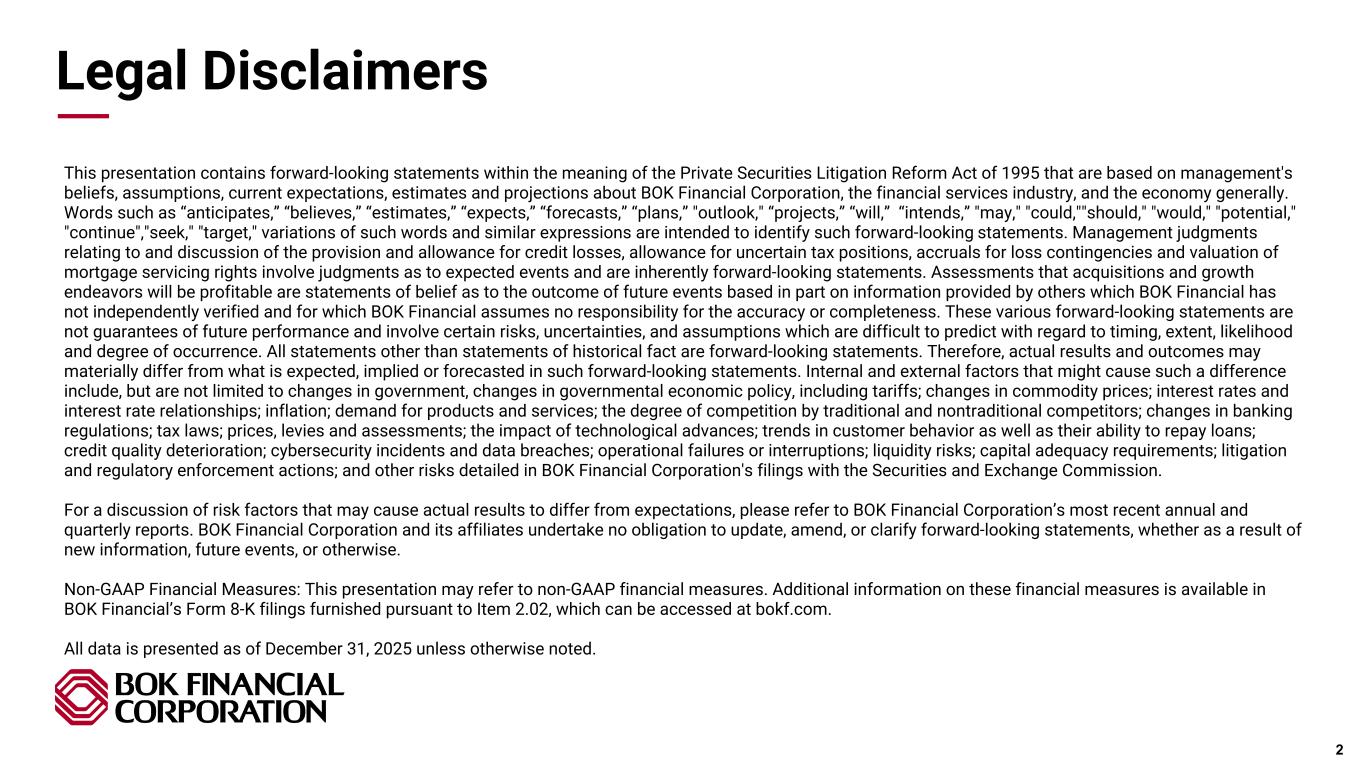 Pri m ar y & se co nd ar y br an d co lor s Data viz colors Data viz monochromatic This presentation contains forward-looking statements within the meaning of the Private Securities Litigation Reform Act of 1995 that are based on management's beliefs, assumptions, current expectations, estimates and projections about BOK Financial Corporation, the financial services industry, and the economy generally. Words such as “anticipates,” “believes,” “estimates,” “expects,” “forecasts,” “plans,” "outlook," “projects,” “will,” “intends,” "may," "could,""should," "would," "potential," "continue","seek," "target," variations of such words and similar expressions are intended to identify such forward-looking statements. Management judgments relating to and discussion of the provision and allowance for credit losses, allowance for uncertain tax positions, accruals for loss contingencies and valuation of mortgage servicing rights involve judgments as to expected events and are inherently forward-looking statements. Assessments that acquisitions and growth endeavors will be profitable are statements of belief as to the outcome of future events based in part on information provided by others which BOK Financial has not independently verified and for which BOK Financial assumes no responsibility for the accuracy or completeness. These various forward-looking statements are not guarantees of future performance and involve certain risks, uncertainties, and assumptions which are difficult to predict with regard to timing, extent, likelihood and degree of occurrence. All statements other than statements of historical fact are forward-looking statements. Therefore, actual results and outcomes may materially differ from what is expected, implied or forecasted in such forward-looking statements. Internal and external factors that might cause such a difference include, but are not limited to changes in government, changes in governmental economic policy, including tariffs; changes in commodity prices; interest rates and interest rate relationships; inflation; demand for products and services; the degree of competition by traditional and nontraditional competitors; changes in banking regulations; tax laws; prices, levies and assessments; the impact of technological advances; trends in customer behavior as well as their ability to repay loans; credit quality deterioration; cybersecurity incidents and data breaches; operational failures or interruptions; liquidity risks; capital adequacy requirements; litigation and regulatory enforcement actions; and other risks detailed in BOK Financial Corporation's filings with the Securities and Exchange Commission. For a discussion of risk factors that may cause actual results to differ from expectations, please refer to BOK Financial Corporation’s most recent annual and quarterly reports. BOK Financial Corporation and its affiliates undertake no obligation to update, amend, or clarify forward-looking statements, whether as a result of new information, future events, or otherwise. Non-GAAP Financial Measures: This presentation may refer to non-GAAP financial measures. Additional information on these financial measures is available in BOK Financial’s Form 8-K filings furnished pursuant to Item 2.02, which can be accessed at bokf.com. All data is presented as of December 31, 2025 unless otherwise noted. Legal Disclaimers 2