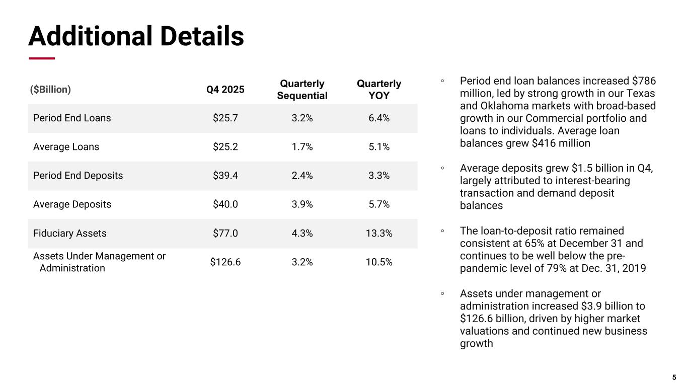 Pri m ar y & se co nd ar y br an d co lor s Data viz colors Data viz monochromatic Q4 Financial Highlights * Non-GAAP measure Attributable to shareholders Per share (diluted) Net Income • Net Income was $177.3 million, or a record high $2.89 per diluted share. Excluding the gain recognized on the sale of a merchant banking investment and the FDIC special assessment benefit, net income would have been $152.1 million, or $2.48 per diluted share, in the fourth quarter of 2025* • Net interest margin expanded 7 basis points to 2.98% and core net interest margin, excluding trading, grew 6 basis points to 3.22%* • Period end loans grew $786 million, or 3.2%, to $25.7 billion with strong growth throughout our Commercial portfolio • Asset quality remains excellent with non-performing assets, excluding loans guaranteed by U.S. government agencies, totaling $66 million, or 0.26% of outstanding loans and repossessed assets. Net charge-offs were $1.4 million during Q4 • Continued strong capital and liquidity position with TCE at 9.5% and a loan to deposit ratio of 65% 4 $136.2 $119.8 $140.0 $140.9 $177.3 $2.12 $1.86 $2.19 $2.22 $2.89 4Q24 1Q25 2Q25 3Q25 4Q25 ($Million, exc. EPS) Q4 2025 Q3 2025 Q4 2024 Net income $177.3 $140.9 $136.2 Diluted EPS 2.89 2.22 2.12 Net income before taxes $228.5 $176.6 $175.4 Provision for credit losses $0.0 $2.0 $0.0 Pre-provision net revenue* $228.5 $178.6 $175.4 Efficiency ratio* 60.7% 66.7% 65.6% Revenue Composition as of 12/31/2025 62% 8% 12% 6% 6% 3% 3% Net Interest Income Trading & Brokerage Fiduciary & Asset Management Transaction Card Deposit Service Charges Mortgage Banking Other Revenue