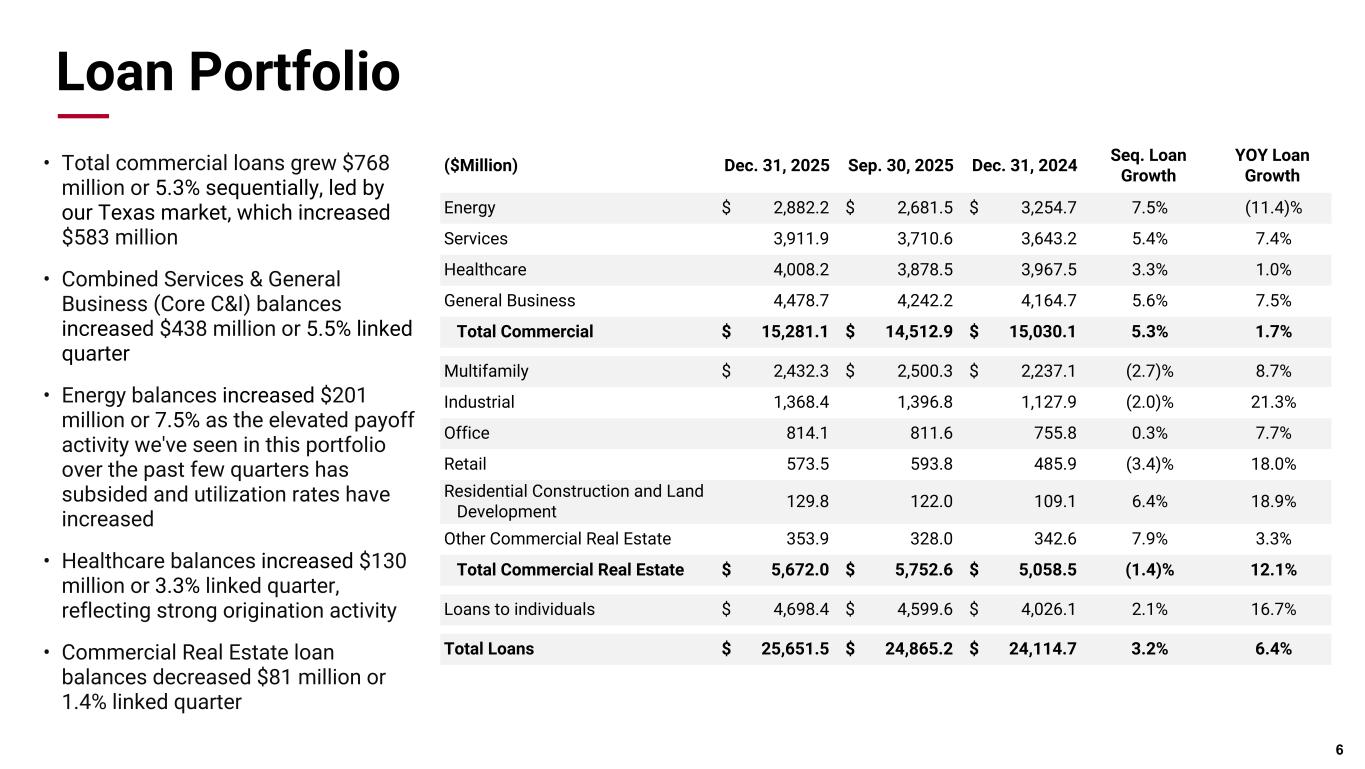 Pri m ar y & se co nd ar y br an d co lor s Data viz colors Data viz monochromatic Additional Details 5 ◦ Period end loan balances increased $786 million, led by strong growth in our Texas and Oklahoma markets with broad-based growth in our Commercial portfolio and loans to individuals. Average loan balances grew $416 million ◦ Average deposits grew $1.5 billion in Q4, largely attributed to interest-bearing transaction and demand deposit balances ◦ The loan-to-deposit ratio remained consistent at 65% at December 31 and continues to be well below the pre- pandemic level of 79% at Dec. 31, 2019 ◦ Assets under management or administration increased $3.9 billion to $126.6 billion, driven by higher market valuations and continued new business growth ($Billion) Q4 2025 Quarterly Sequential Quarterly YOY Period End Loans $25.7 3.2% 6.4% Average Loans $25.2 1.7% 5.1% Period End Deposits $39.4 2.4% 3.3% Average Deposits $40.0 3.9% 5.7% Fiduciary Assets $77.0 4.3% 13.3% Assets Under Management or Administration $126.6 3.2% 10.5%