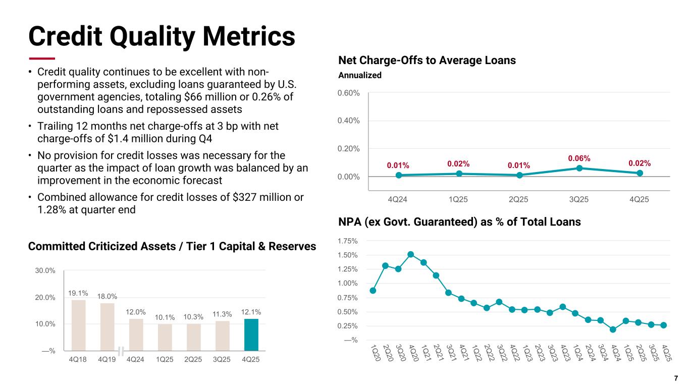 Pri m ar y & se co nd ar y br an d co lor s Data viz colors Data viz monochromatic Loan Portfolio • Total commercial loans grew $768 million or 5.3% sequentially, led by our Texas market, which increased $583 million • Combined Services & General Business (Core C&I) balances increased $438 million or 5.5% linked quarter • Energy balances increased $201 million or 7.5% as the elevated payoff activity we've seen in this portfolio over the past few quarters has subsided and utilization rates have increased • Healthcare balances increased $130 million or 3.3% linked quarter, reflecting strong origination activity • Commercial Real Estate loan balances decreased $81 million or 1.4% linked quarter 6 ($Million) Dec. 31, 2025 Sep. 30, 2025 Dec. 31, 2024 Seq. Loan Growth YOY Loan Growth Energy $ 2,882.2 $ 2,681.5 $ 3,254.7 7.5% (11.4)% Services 3,911.9 3,710.6 3,643.2 5.4% 7.4% Healthcare 4,008.2 3,878.5 3,967.5 3.3% 1.0% General Business 4,478.7 4,242.2 4,164.7 5.6% 7.5% Total Commercial $ 15,281.1 $ 14,512.9 $ 15,030.1 5.3% 1.7% Multifamily $ 2,432.3 $ 2,500.3 $ 2,237.1 (2.7)% 8.7% Industrial 1,368.4 1,396.8 1,127.9 (2.0)% 21.3% Office 814.1 811.6 755.8 0.3% 7.7% Retail 573.5 593.8 485.9 (3.4)% 18.0% Residential Construction and Land Development 129.8 122.0 109.1 6.4% 18.9% Other Commercial Real Estate 353.9 328.0 342.6 7.9% 3.3% Total Commercial Real Estate $ 5,672.0 $ 5,752.6 $ 5,058.5 (1.4)% 12.1% Loans to individuals $ 4,698.4 $ 4,599.6 $ 4,026.1 2.1% 16.7% Total Loans $ 25,651.5 $ 24,865.2 $ 24,114.7 3.2% 6.4%