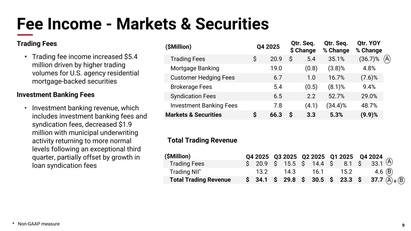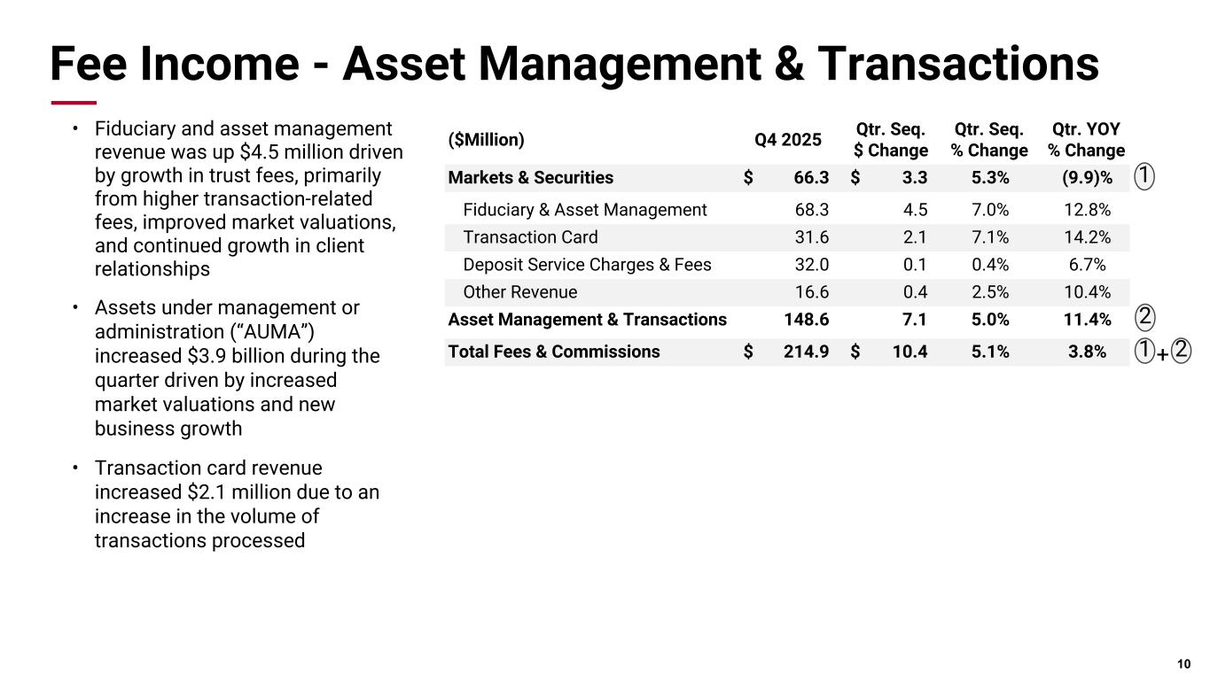 Pri m ar y & se co nd ar y br an d co lor s Data viz colors Data viz monochromatic Fee Income - Markets & Securities Trading Fees • Trading fee income increased $5.4 million driven by higher trading volumes for U.S. agency residential mortgage-backed securities Investment Banking Fees • Investment banking revenue, which includes investment banking fees and syndication fees, decreased $1.9 million with municipal underwriting activity returning to more normal levels following an exceptional third quarter, partially offset by growth in loan syndication fees 9 ($Million) Q4 2025 Qtr. Seq. $ Change Qtr. Seq. % Change Qtr. YOY % Change Trading Fees $ 20.9 $ 5.4 35.1% (36.7)% Mortgage Banking 19.0 (0.8) (3.8)% 4.8% Customer Hedging Fees 6.7 1.0 16.7% (7.6)% Brokerage Fees 5.4 (0.5) (8.1)% 9.4% Syndication Fees 6.5 2.2 52.7% 29.0% Investment Banking Fees 7.8 (4.1) (34.4)% 48.7% Markets & Securities $ 66.3 $ 3.3 5.3% (9.9)% ($Million) Q4 2025 Q3 2025 Q2 2025 Q1 2025 Q4 2024 Trading Fees $ 20.9 $ 15.5 $ 14.4 $ 8.1 $ 33.1 Trading NII* 13.2 14.3 16.1 15.2 4.6 Total Trading Revenue $ 34.1 $ 29.8 $ 30.5 $ 23.3 $ 37.7 A A Total Trading Revenue A + B B * Non-GAAP measure