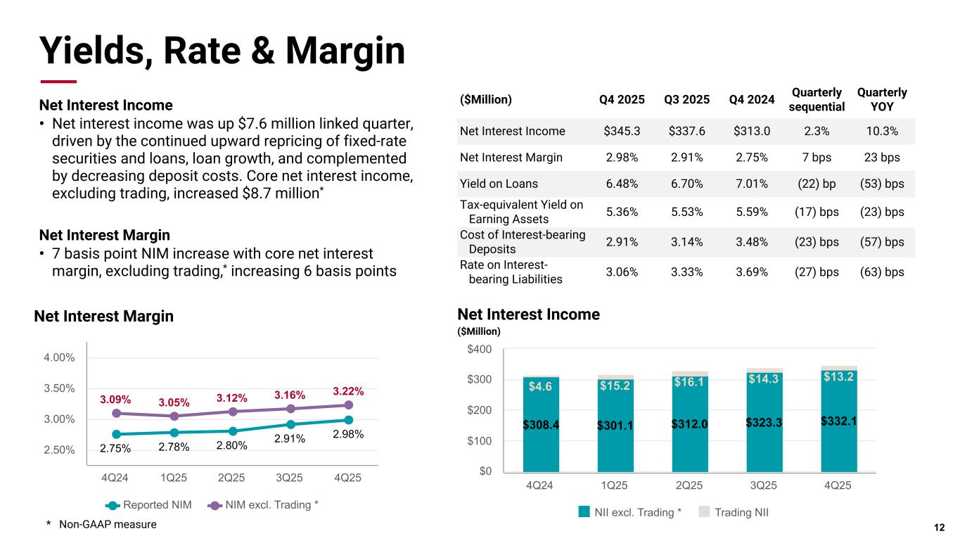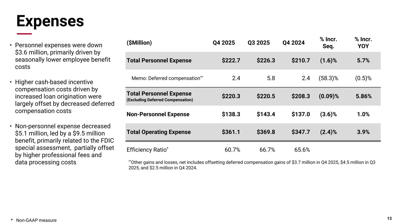 Pri m ar y & se co nd ar y br an d co lor s Data viz colors Data viz monochromatic Yields, Rate & Margin Net Interest Income • Net interest income was up $7.6 million linked quarter, driven by the continued upward repricing of fixed-rate securities and loans, loan growth, and complemented by decreasing deposit costs. Core net interest income, excluding trading, increased $8.7 million* Net Interest Margin • 7 basis point NIM increase with core net interest margin, excluding trading,* increasing 6 basis points 12 ($Million) Q4 2025 Q3 2025 Q4 2024 Quarterly sequential Quarterly YOY Net Interest Income $345.3 $337.6 $313.0 2.3% 10.3% Net Interest Margin 2.98% 2.91% 2.75% 7 bps 23 bps Yield on Loans 6.48% 6.70% 7.01% (22) bp (53) bps Tax-equivalent Yield on Earning Assets 5.36% 5.53% 5.59% (17) bps (23) bps Cost of Interest-bearing Deposits 2.91% 3.14% 3.48% (23) bps (57) bps Rate on Interest- bearing Liabilities 3.06% 3.33% 3.69% (27) bps (63) bps Net Interest Income ($Million) $308.4 $301.1 $312.0 $323.3 $332.1 $4.6 $15.2 $16.1 $14.3 $13.2 NII excl. Trading * Trading NII 4Q24 1Q25 2Q25 3Q25 4Q25 $0 $100 $200 $300 $400 2.75% 2.78% 2.80% 2.91% 2.98% 3.09% 3.05% 3.12% 3.16% 3.22% Reported NIM NIM excl. Trading * 4Q24 1Q25 2Q25 3Q25 4Q25 2.50% 3.00% 3.50% 4.00% Net Interest Margin * Non-GAAP measure