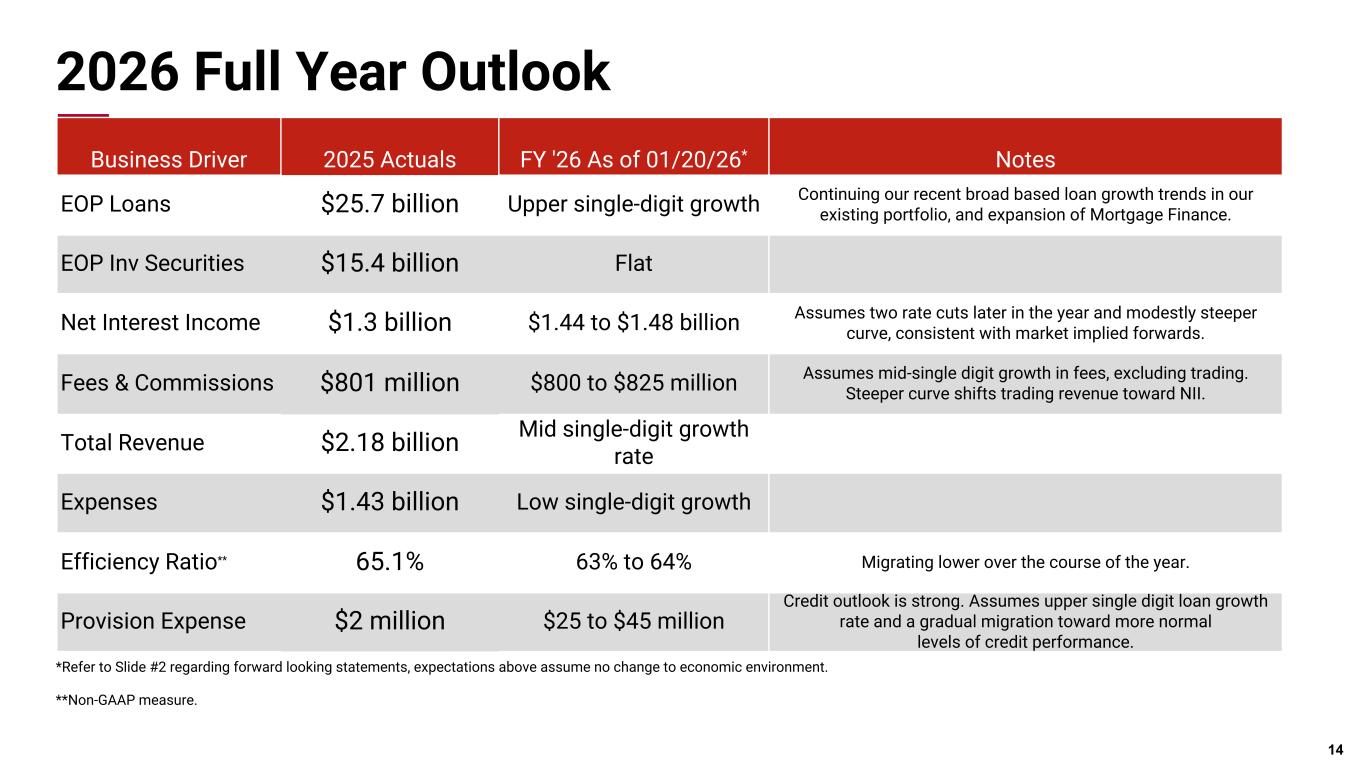 Pri m ar y & se co nd ar y br an d co lor s Data viz colors Data viz monochromatic Expenses • Personnel expenses were down $3.6 million, primarily driven by seasonally lower employee benefit costs • Higher cash-based incentive compensation costs driven by increased loan origination were largely offset by decreased deferred compensation costs • Non-personnel expense decreased $5.1 million, led by a $9.5 million benefit, primarily related to the FDIC special assessment, partially offset by higher professional fees and data processing costs 13 ($Million) Q4 2025 Q3 2025 Q4 2024 % Incr. Seq. % Incr. YOY Total Personnel Expense $222.7 $226.3 $210.7 (1.6)% 5.7% Memo: Deferred compensation** 2.4 5.8 2.4 (58.3)% (0.5)% Total Personnel Expense (Excluding Deferred Compensation) $220.3 $220.5 $208.3 (0.09)% 5.86% Non-Personnel Expense $138.3 $143.4 $137.0 (3.6)% 1.0% Total Operating Expense $361.1 $369.8 $347.7 (2.4)% 3.9% Efficiency Ratio* 60.7% 66.7% 65.6% * Non-GAAP measure **Other gains and losses, net includes offsetting deferred compensation gains of $3.7 million in Q4 2025, $4.5 million in Q3 2025, and $2.5 million in Q4 2024.
