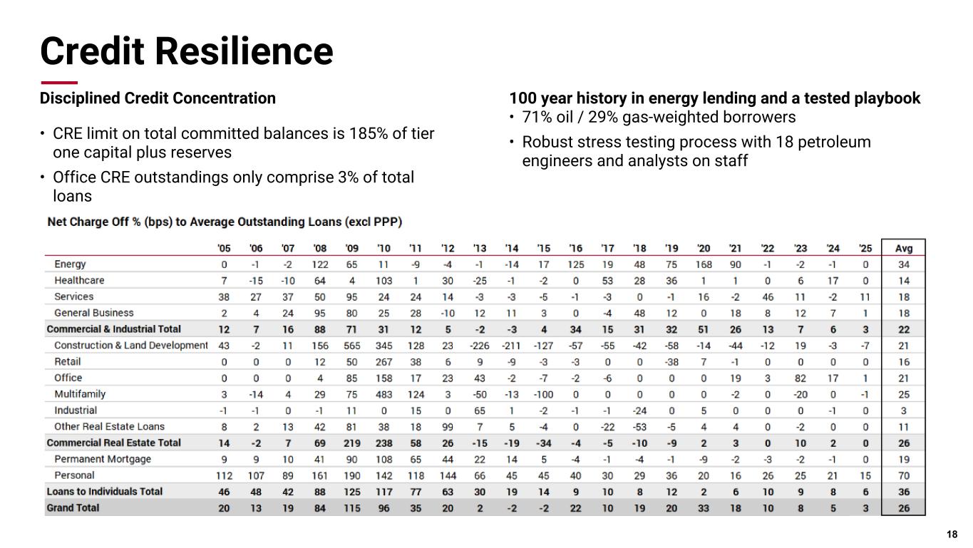 Pri m ar y & se co nd ar y br an d co lor s Data viz colors Data viz monochromatic Credit Resilience Disciplined Credit Concentration • CRE limit on total committed balances is 185% of tier one capital plus reserves • Office CRE outstandings only comprise 3% of total loans 18 100 year history in energy lending and a tested playbook • 71% oil / 29% gas-weighted borrowers • Robust stress testing process with 18 petroleum engineers and analysts on staff