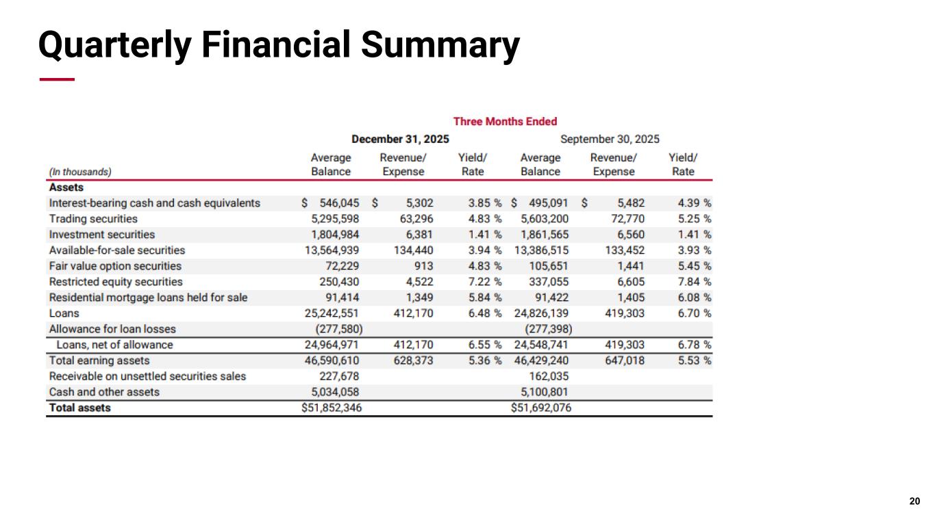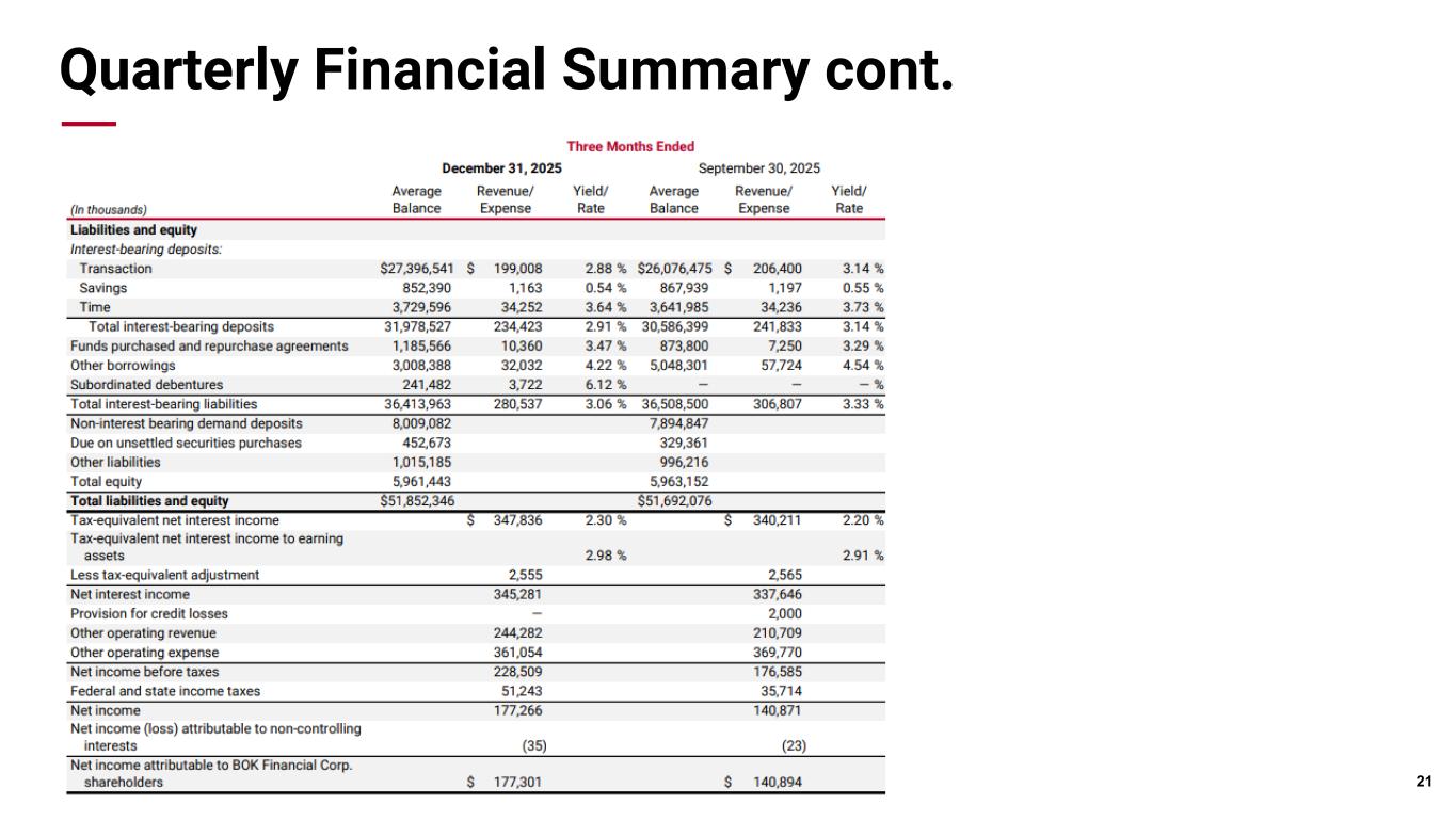 Pri m ar y & se co nd ar y br an d co lor s Data viz colors Data viz monochromatic Securities and Interest Rate Risk Position Interest Rate Risk • Approximately 76% of the total loan portfolio is variable rate or fixed rate that reprice within a year • Approximately 84% of Commercial and Commercial Real Estate portfolios are variable rate or fixed rate that reprice within a year • Sensitivity to betas - The impact of decreasing our deposit beta by 10% in a down -100 interest rate scenario is (0.62)% on NII 19 Scenario* Δ NII % Δ NII $ Down 200 Ramp, year 1 1.99% $28.7 million Down 100 Ramp, year 1 0.86% $12.5 million Up 100 Ramp, year 1 (0.95)% $(13.7) million Up 200 Ramp, year 1 (2.15)% $(31.0) million Securities Portfolio • Short duration with limited extension, current portfolio duration is 3.0 years, extending to only 3.6 years if rates increase 200 bps • RMBS portfolio is all "AAA" rated with average credit enhancement of ~18% • Portfolio runoff for Q4 2025 was $645 million 94% 5% 1% Govt/GSE Guaranteed RMBS Muni BOKF Securities by Guarantee Type 12/31/2025