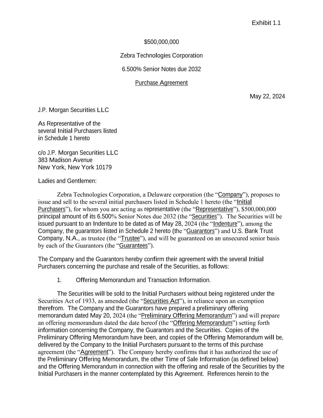 Exhibit 1.1 $500,000,000 Zebra Technologies Corporation 6.500% Senior Notes due 2032 Purchase Agreement May 22, 2024 J.P. Morgan Securities LLC As Representative of the several Initial Purchasers listed in Schedule 1 hereto c/o J.P. Morgan Securities LLC 383 Madison Avenue New York, New York 10179 Ladies and Gentlemen: Zebra Technologies Corporation, a Delaware corporation (the “Company”), proposes to issue and sell to the several initial purchasers listed in Schedule 1 hereto (the “Initial Purchasers”), for whom you are acting as representative (the “Representative”), $500,000,000 principal amount of its 6.500% Senior Notes due 2032 (the “Securities”). The Securities will be issued pursuant to an Indenture to be dated as of May 28, 2024 (the “Indenture”), among the Company, the guarantors listed in Schedule 2 hereto (the “Guarantors”) and U.S. Bank Trust Company, N.A., as trustee (the “Trustee”), and will be guaranteed on an unsecured senior basis by each of the Guarantors (the “Guarantees”). The Company and the Guarantors hereby confirm their agreement with the several Initial Purchasers concerning the purchase and resale of the Securities, as follows: 1. Offering Memorandum and Transaction Information. The Securities will be sold to the Initial Purchasers without being registered under the Securities Act of 1933, as amended (the “Securities Act”), in reliance upon an exemption therefrom. The Company and the Guarantors have prepared a preliminary offering memorandum dated May 20, 2024 (the “Preliminary Offering Memorandum”) and will prepare an offering memorandum dated the date hereof (the “Offering Memorandum”) setting forth information concerning the Company, the Guarantors and the Securities. Copies of the Preliminary Offering Memorandum have been, and copies of the Offering Memorandum will be, delivered by the Company to the Initial Purchasers pursuant to the terms of this purchase agreement (the “Agreement”). The Company hereby confirms that it has authorized the use of the Preliminary Offering Memorandum, the other Time of Sale Information (as defined below) and the Offering Memorandum in connection with the offering and resale of the Securities by the Initial Purchasers in the manner contemplated by this Agreement. References herein to the