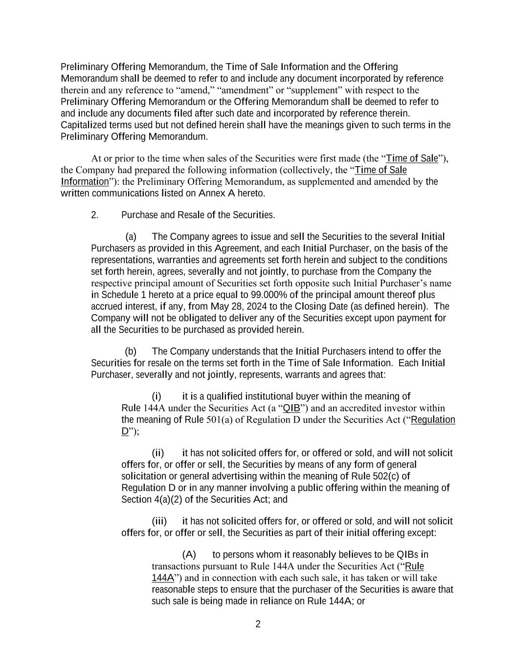 2 Preliminary Offering Memorandum, the Time of Sale Information and the Offering Memorandum shall be deemed to refer to and include any document incorporated by reference therein and any reference to “amend,” “amendment” or “supplement” with respect to the Preliminary Offering Memorandum or the Offering Memorandum shall be deemed to refer to and include any documents filed after such date and incorporated by reference therein. Capitalized terms used but not defined herein shall have the meanings given to such terms in the Preliminary Offering Memorandum. At or prior to the time when sales of the Securities were first made (the “Time of Sale”), the Company had prepared the following information (collectively, the “Time of Sale Information”): the Preliminary Offering Memorandum, as supplemented and amended by the written communications listed on Annex A hereto. 2. Purchase and Resale of the Securities. (a) The Company agrees to issue and sell the Securities to the several Initial Purchasers as provided in this Agreement, and each Initial Purchaser, on the basis of the representations, warranties and agreements set forth herein and subject to the conditions set forth herein, agrees, severally and not jointly, to purchase from the Company the respective principal amount of Securities set forth opposite such Initial Purchaser’s name in Schedule 1 hereto at a price equal to 99.000% of the principal amount thereof plus accrued interest, if any, from May 28, 2024 to the Closing Date (as defined herein). The Company will not be obligated to deliver any of the Securities except upon payment for all the Securities to be purchased as provided herein. (b) The Company understands that the Initial Purchasers intend to offer the Securities for resale on the terms set forth in the Time of Sale Information. Each Initial Purchaser, severally and not jointly, represents, warrants and agrees that: (i) it is a qualified institutional buyer within the meaning of Rule 144A under the Securities Act (a “QIB”) and an accredited investor within the meaning of Rule 501(a) of Regulation D under the Securities Act (“Regulation D”); (ii) it has not solicited offers for, or offered or sold, and will not solicit offers for, or offer or sell, the Securities by means of any form of general solicitation or general advertising within the meaning of Rule 502(c) of Regulation D or in any manner involving a public offering within the meaning of Section 4(a)(2) of the Securities Act; and (iii) it has not solicited offers for, or offered or sold, and will not solicit offers for, or offer or sell, the Securities as part of their initial offering except: (A) to persons whom it reasonably believes to be QIBs in transactions pursuant to Rule 144A under the Securities Act (“Rule 144A”) and in connection with each such sale, it has taken or will take reasonable steps to ensure that the purchaser of the Securities is aware that such sale is being made in reliance on Rule 144A; or