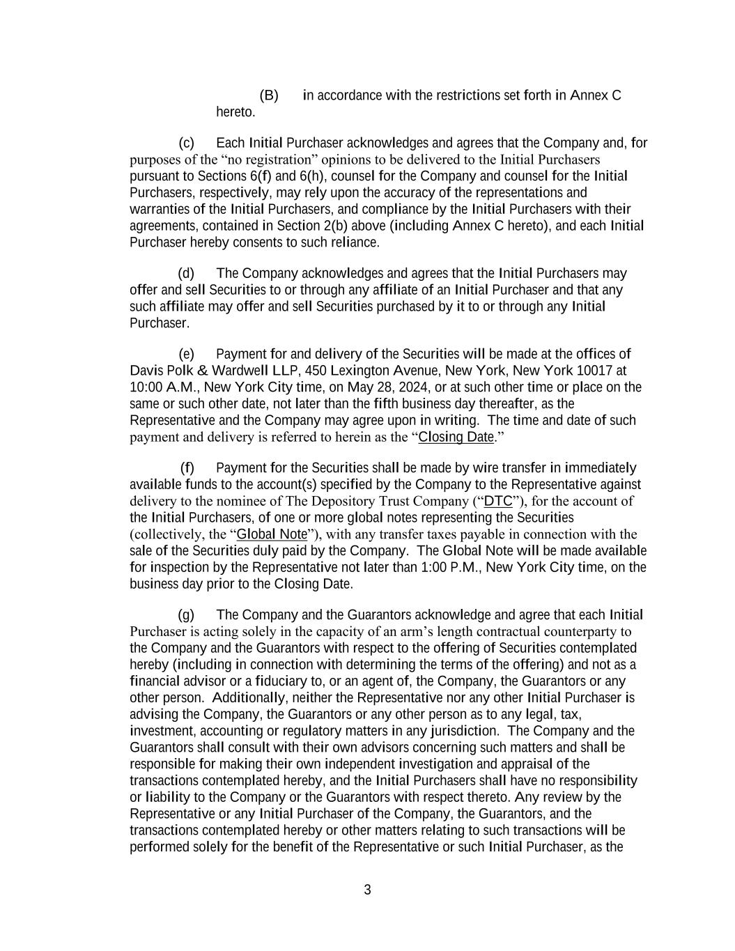 3 (B) in accordance with the restrictions set forth in Annex C hereto. (c) Each Initial Purchaser acknowledges and agrees that the Company and, for purposes of the “no registration” opinions to be delivered to the Initial Purchasers pursuant to Sections 6(f) and 6(h), counsel for the Company and counsel for the Initial Purchasers, respectively, may rely upon the accuracy of the representations and warranties of the Initial Purchasers, and compliance by the Initial Purchasers with their agreements, contained in Section 2(b) above (including Annex C hereto), and each Initial Purchaser hereby consents to such reliance. (d) The Company acknowledges and agrees that the Initial Purchasers may offer and sell Securities to or through any affiliate of an Initial Purchaser and that any such affiliate may offer and sell Securities purchased by it to or through any Initial Purchaser. (e) Payment for and delivery of the Securities will be made at the offices of Davis Polk & Wardwell LLP, 450 Lexington Avenue, New York, New York 10017 at 10:00 A.M., New York City time, on May 28, 2024, or at such other time or place on the same or such other date, not later than the fifth business day thereafter, as the Representative and the Company may agree upon in writing. The time and date of such payment and delivery is referred to herein as the “Closing Date.” (f) Payment for the Securities shall be made by wire transfer in immediately available funds to the account(s) specified by the Company to the Representative against delivery to the nominee of The Depository Trust Company (“DTC”), for the account of the Initial Purchasers, of one or more global notes representing the Securities (collectively, the “Global Note”), with any transfer taxes payable in connection with the sale of the Securities duly paid by the Company. The Global Note will be made available for inspection by the Representative not later than 1:00 P.M., New York City time, on the business day prior to the Closing Date. (g) The Company and the Guarantors acknowledge and agree that each Initial Purchaser is acting solely in the capacity of an arm’s length contractual counterparty to the Company and the Guarantors with respect to the offering of Securities contemplated hereby (including in connection with determining the terms of the offering) and not as a financial advisor or a fiduciary to, or an agent of, the Company, the Guarantors or any other person. Additionally, neither the Representative nor any other Initial Purchaser is advising the Company, the Guarantors or any other person as to any legal, tax, investment, accounting or regulatory matters in any jurisdiction. The Company and the Guarantors shall consult with their own advisors concerning such matters and shall be responsible for making their own independent investigation and appraisal of the transactions contemplated hereby, and the Initial Purchasers shall have no responsibility or liability to the Company or the Guarantors with respect thereto. Any review by the Representative or any Initial Purchaser of the Company, the Guarantors, and the transactions contemplated hereby or other matters relating to such transactions will be performed solely for the benefit of the Representative or such Initial Purchaser, as the