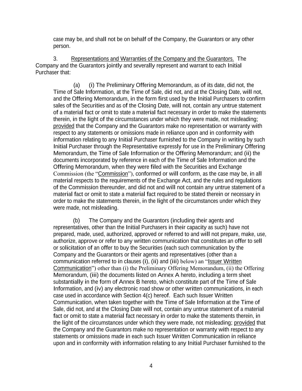 4 case may be, and shall not be on behalf of the Company, the Guarantors or any other person. 3. Representations and Warranties of the Company and the Guarantors. The Company and the Guarantors jointly and severally represent and warrant to each Initial Purchaser that: (a) (i) The Preliminary Offering Memorandum, as of its date, did not, the Time of Sale Information, at the Time of Sale, did not, and at the Closing Date, will not, and the Offering Memorandum, in the form first used by the Initial Purchasers to confirm sales of the Securities and as of the Closing Date, will not, contain any untrue statement of a material fact or omit to state a material fact necessary in order to make the statements therein, in the light of the circumstances under which they were made, not misleading; provided that the Company and the Guarantors make no representation or warranty with respect to any statements or omissions made in reliance upon and in conformity with information relating to any Initial Purchaser furnished to the Company in writing by such Initial Purchaser through the Representative expressly for use in the Preliminary Offering Memorandum, the Time of Sale Information or the Offering Memorandum; and (ii) the documents incorporated by reference in each of the Time of Sale Information and the Offering Memorandum, when they were filed with the Securities and Exchange Commission (the “Commission”), conformed or will conform, as the case may be, in all material respects to the requirements of the Exchange Act, and the rules and regulations of the Commission thereunder, and did not and will not contain any untrue statement of a material fact or omit to state a material fact required to be stated therein or necessary in order to make the statements therein, in the light of the circumstances under which they were made, not misleading. (b) The Company and the Guarantors (including their agents and representatives, other than the Initial Purchasers in their capacity as such) have not prepared, made, used, authorized, approved or referred to and will not prepare, make, use, authorize, approve or refer to any written communication that constitutes an offer to sell or solicitation of an offer to buy the Securities (each such communication by the Company and the Guarantors or their agents and representatives (other than a communication referred to in clauses (i), (ii) and (iii) below) an “Issuer Written Communication”) other than (i) the Preliminary Offering Memorandum, (ii) the Offering Memorandum, (iii) the documents listed on Annex A hereto, including a term sheet substantially in the form of Annex B hereto, which constitute part of the Time of Sale Information, and (iv) any electronic road show or other written communications, in each case used in accordance with Section 4(c) hereof. Each such Issuer Written Communication, when taken together with the Time of Sale Information at the Time of Sale, did not, and at the Closing Date will not, contain any untrue statement of a material fact or omit to state a material fact necessary in order to make the statements therein, in the light of the circumstances under which they were made, not misleading; provided that the Company and the Guarantors make no representation or warranty with respect to any statements or omissions made in each such Issuer Written Communication in reliance upon and in conformity with information relating to any Initial Purchaser furnished to the