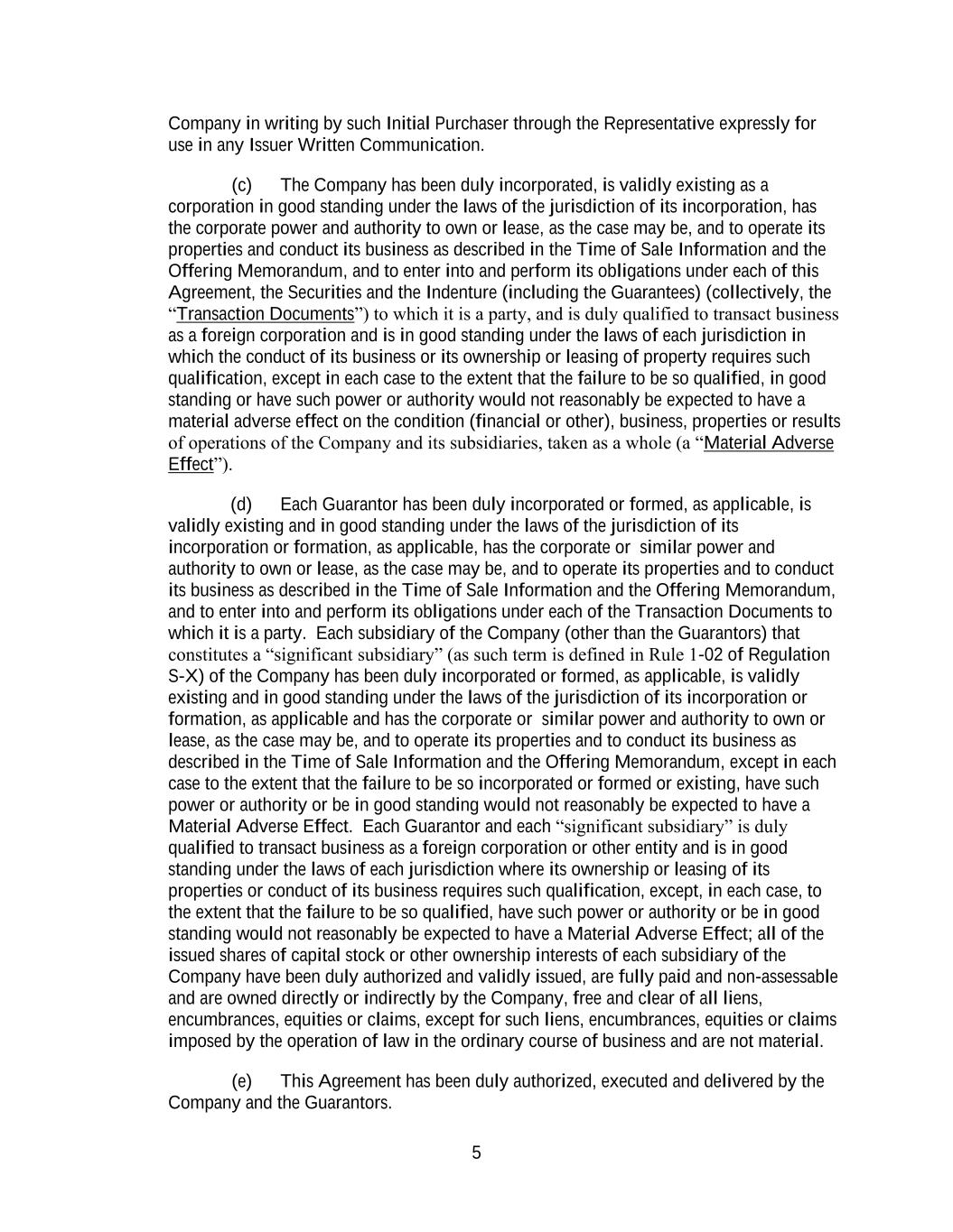 5 Company in writing by such Initial Purchaser through the Representative expressly for use in any Issuer Written Communication. (c) The Company has been duly incorporated, is validly existing as a corporation in good standing under the laws of the jurisdiction of its incorporation, has the corporate power and authority to own or lease, as the case may be, and to operate its properties and conduct its business as described in the Time of Sale Information and the Offering Memorandum, and to enter into and perform its obligations under each of this Agreement, the Securities and the Indenture (including the Guarantees) (collectively, the “Transaction Documents”) to which it is a party, and is duly qualified to transact business as a foreign corporation and is in good standing under the laws of each jurisdiction in which the conduct of its business or its ownership or leasing of property requires such qualification, except in each case to the extent that the failure to be so qualified, in good standing or have such power or authority would not reasonably be expected to have a material adverse effect on the condition (financial or other), business, properties or results of operations of the Company and its subsidiaries, taken as a whole (a “Material Adverse Effect”). (d) Each Guarantor has been duly incorporated or formed, as applicable, is validly existing and in good standing under the laws of the jurisdiction of its incorporation or formation, as applicable, has the corporate or similar power and authority to own or lease, as the case may be, and to operate its properties and to conduct its business as described in the Time of Sale Information and the Offering Memorandum, and to enter into and perform its obligations under each of the Transaction Documents to which it is a party. Each subsidiary of the Company (other than the Guarantors) that constitutes a “significant subsidiary” (as such term is defined in Rule 1-02 of Regulation S-X) of the Company has been duly incorporated or formed, as applicable, is validly existing and in good standing under the laws of the jurisdiction of its incorporation or formation, as applicable and has the corporate or similar power and authority to own or lease, as the case may be, and to operate its properties and to conduct its business as described in the Time of Sale Information and the Offering Memorandum, except in each case to the extent that the failure to be so incorporated or formed or existing, have such power or authority or be in good standing would not reasonably be expected to have a Material Adverse Effect. Each Guarantor and each “significant subsidiary” is duly qualified to transact business as a foreign corporation or other entity and is in good standing under the laws of each jurisdiction where its ownership or leasing of its properties or conduct of its business requires such qualification, except, in each case, to the extent that the failure to be so qualified, have such power or authority or be in good standing would not reasonably be expected to have a Material Adverse Effect; all of the issued shares of capital stock or other ownership interests of each subsidiary of the Company have been duly authorized and validly issued, are fully paid and non-assessable and are owned directly or indirectly by the Company, free and clear of all liens, encumbrances, equities or claims, except for such liens, encumbrances, equities or claims imposed by the operation of law in the ordinary course of business and are not material. (e) This Agreement has been duly authorized, executed and delivered by the Company and the Guarantors.