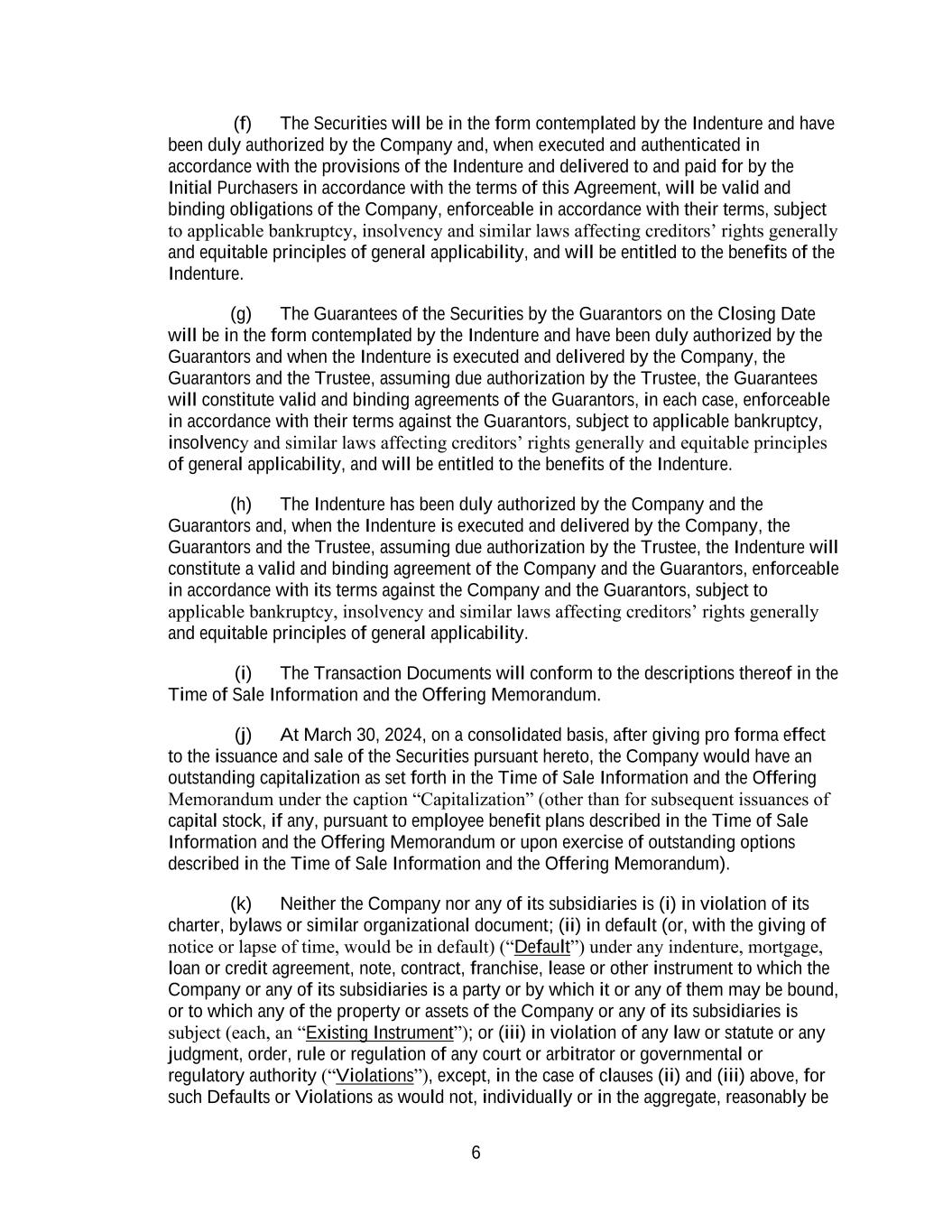 6 (f) The Securities will be in the form contemplated by the Indenture and have been duly authorized by the Company and, when executed and authenticated in accordance with the provisions of the Indenture and delivered to and paid for by the Initial Purchasers in accordance with the terms of this Agreement, will be valid and binding obligations of the Company, enforceable in accordance with their terms, subject to applicable bankruptcy, insolvency and similar laws affecting creditors’ rights generally and equitable principles of general applicability, and will be entitled to the benefits of the Indenture. (g) The Guarantees of the Securities by the Guarantors on the Closing Date will be in the form contemplated by the Indenture and have been duly authorized by the Guarantors and when the Indenture is executed and delivered by the Company, the Guarantors and the Trustee, assuming due authorization by the Trustee, the Guarantees will constitute valid and binding agreements of the Guarantors, in each case, enforceable in accordance with their terms against the Guarantors, subject to applicable bankruptcy, insolvency and similar laws affecting creditors’ rights generally and equitable principles of general applicability, and will be entitled to the benefits of the Indenture. (h) The Indenture has been duly authorized by the Company and the Guarantors and, when the Indenture is executed and delivered by the Company, the Guarantors and the Trustee, assuming due authorization by the Trustee, the Indenture will constitute a valid and binding agreement of the Company and the Guarantors, enforceable in accordance with its terms against the Company and the Guarantors, subject to applicable bankruptcy, insolvency and similar laws affecting creditors’ rights generally and equitable principles of general applicability. (i) The Transaction Documents will conform to the descriptions thereof in the Time of Sale Information and the Offering Memorandum. (j) At March 30, 2024, on a consolidated basis, after giving pro forma effect to the issuance and sale of the Securities pursuant hereto, the Company would have an outstanding capitalization as set forth in the Time of Sale Information and the Offering Memorandum under the caption “Capitalization” (other than for subsequent issuances of capital stock, if any, pursuant to employee benefit plans described in the Time of Sale Information and the Offering Memorandum or upon exercise of outstanding options described in the Time of Sale Information and the Offering Memorandum). (k) Neither the Company nor any of its subsidiaries is (i) in violation of its charter, bylaws or similar organizational document; (ii) in default (or, with the giving of notice or lapse of time, would be in default) (“Default”) under any indenture, mortgage, loan or credit agreement, note, contract, franchise, lease or other instrument to which the Company or any of its subsidiaries is a party or by which it or any of them may be bound, or to which any of the property or assets of the Company or any of its subsidiaries is subject (each, an “Existing Instrument”); or (iii) in violation of any law or statute or any judgment, order, rule or regulation of any court or arbitrator or governmental or regulatory authority (“Violations”), except, in the case of clauses (ii) and (iii) above, for such Defaults or Violations as would not, individually or in the aggregate, reasonably be