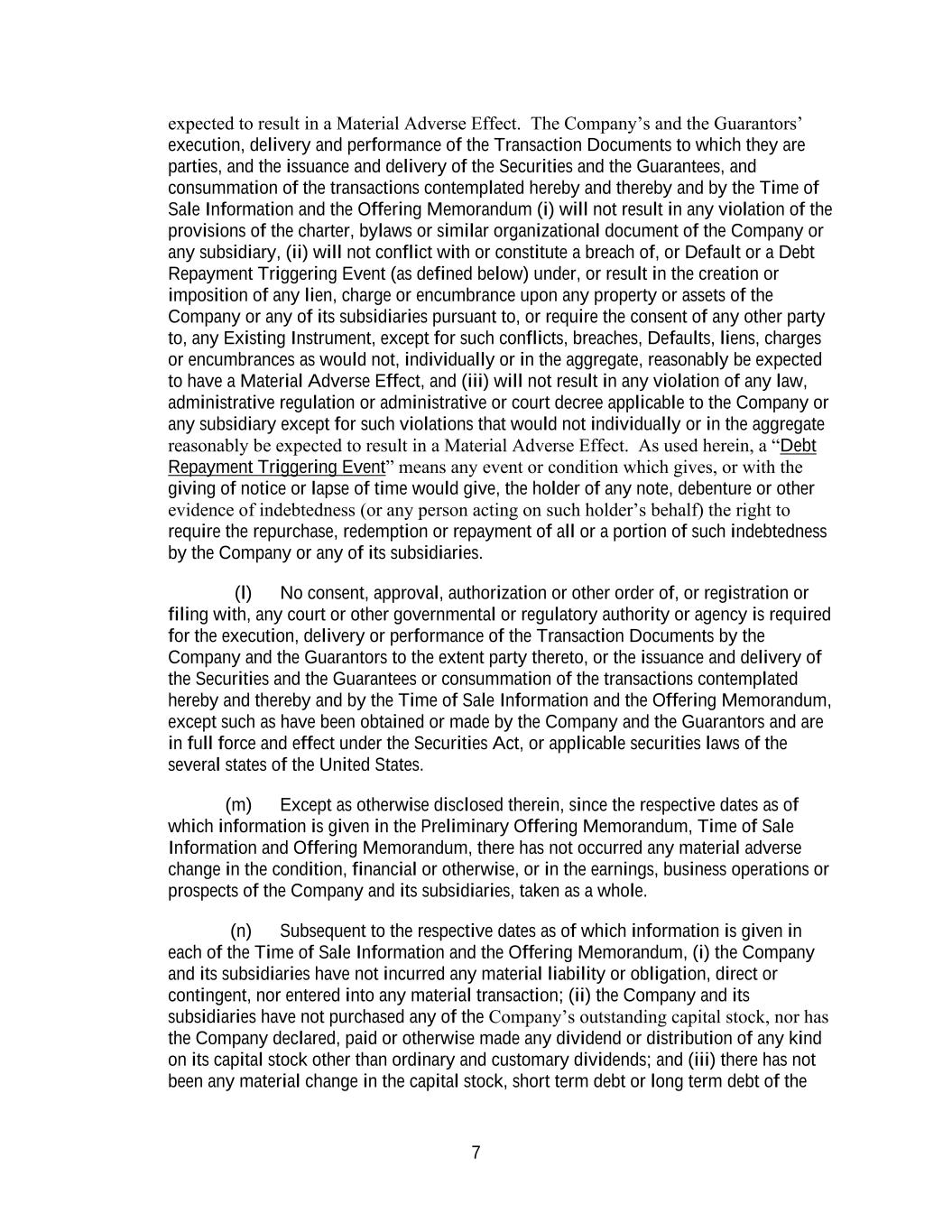 7 expected to result in a Material Adverse Effect. The Company’s and the Guarantors’ execution, delivery and performance of the Transaction Documents to which they are parties, and the issuance and delivery of the Securities and the Guarantees, and consummation of the transactions contemplated hereby and thereby and by the Time of Sale Information and the Offering Memorandum (i) will not result in any violation of the provisions of the charter, bylaws or similar organizational document of the Company or any subsidiary, (ii) will not conflict with or constitute a breach of, or Default or a Debt Repayment Triggering Event (as defined below) under, or result in the creation or imposition of any lien, charge or encumbrance upon any property or assets of the Company or any of its subsidiaries pursuant to, or require the consent of any other party to, any Existing Instrument, except for such conflicts, breaches, Defaults, liens, charges or encumbrances as would not, individually or in the aggregate, reasonably be expected to have a Material Adverse Effect, and (iii) will not result in any violation of any law, administrative regulation or administrative or court decree applicable to the Company or any subsidiary except for such violations that would not individually or in the aggregate reasonably be expected to result in a Material Adverse Effect. As used herein, a “Debt Repayment Triggering Event” means any event or condition which gives, or with the giving of notice or lapse of time would give, the holder of any note, debenture or other evidence of indebtedness (or any person acting on such holder’s behalf) the right to require the repurchase, redemption or repayment of all or a portion of such indebtedness by the Company or any of its subsidiaries. (l) No consent, approval, authorization or other order of, or registration or filing with, any court or other governmental or regulatory authority or agency is required for the execution, delivery or performance of the Transaction Documents by the Company and the Guarantors to the extent party thereto, or the issuance and delivery of the Securities and the Guarantees or consummation of the transactions contemplated hereby and thereby and by the Time of Sale Information and the Offering Memorandum, except such as have been obtained or made by the Company and the Guarantors and are in full force and effect under the Securities Act, or applicable securities laws of the several states of the United States. (m) Except as otherwise disclosed therein, since the respective dates as of which information is given in the Preliminary Offering Memorandum, Time of Sale Information and Offering Memorandum, there has not occurred any material adverse change in the condition, financial or otherwise, or in the earnings, business operations or prospects of the Company and its subsidiaries, taken as a whole. (n) Subsequent to the respective dates as of which information is given in each of the Time of Sale Information and the Offering Memorandum, (i) the Company and its subsidiaries have not incurred any material liability or obligation, direct or contingent, nor entered into any material transaction; (ii) the Company and its subsidiaries have not purchased any of the Company’s outstanding capital stock, nor has the Company declared, paid or otherwise made any dividend or distribution of any kind on its capital stock other than ordinary and customary dividends; and (iii) there has not been any material change in the capital stock, short term debt or long term debt of the