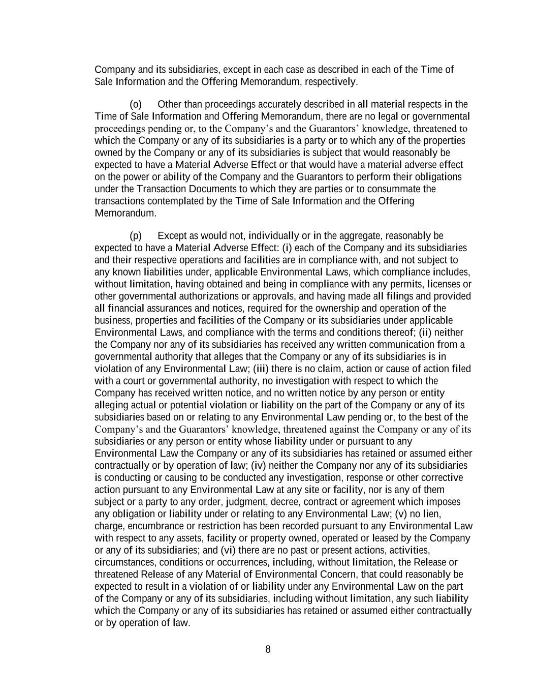 8 Company and its subsidiaries, except in each case as described in each of the Time of Sale Information and the Offering Memorandum, respectively. (o) Other than proceedings accurately described in all material respects in the Time of Sale Information and Offering Memorandum, there are no legal or governmental proceedings pending or, to the Company’s and the Guarantors’ knowledge, threatened to which the Company or any of its subsidiaries is a party or to which any of the properties owned by the Company or any of its subsidiaries is subject that would reasonably be expected to have a Material Adverse Effect or that would have a material adverse effect on the power or ability of the Company and the Guarantors to perform their obligations under the Transaction Documents to which they are parties or to consummate the transactions contemplated by the Time of Sale Information and the Offering Memorandum. (p) Except as would not, individually or in the aggregate, reasonably be expected to have a Material Adverse Effect: (i) each of the Company and its subsidiaries and their respective operations and facilities are in compliance with, and not subject to any known liabilities under, applicable Environmental Laws, which compliance includes, without limitation, having obtained and being in compliance with any permits, licenses or other governmental authorizations or approvals, and having made all filings and provided all financial assurances and notices, required for the ownership and operation of the business, properties and facilities of the Company or its subsidiaries under applicable Environmental Laws, and compliance with the terms and conditions thereof; (ii) neither the Company nor any of its subsidiaries has received any written communication from a governmental authority that alleges that the Company or any of its subsidiaries is in violation of any Environmental Law; (iii) there is no claim, action or cause of action filed with a court or governmental authority, no investigation with respect to which the Company has received written notice, and no written notice by any person or entity alleging actual or potential violation or liability on the part of the Company or any of its subsidiaries based on or relating to any Environmental Law pending or, to the best of the Company’s and the Guarantors’ knowledge, threatened against the Company or any of its subsidiaries or any person or entity whose liability under or pursuant to any Environmental Law the Company or any of its subsidiaries has retained or assumed either contractually or by operation of law; (iv) neither the Company nor any of its subsidiaries is conducting or causing to be conducted any investigation, response or other corrective action pursuant to any Environmental Law at any site or facility, nor is any of them subject or a party to any order, judgment, decree, contract or agreement which imposes any obligation or liability under or relating to any Environmental Law; (v) no lien, charge, encumbrance or restriction has been recorded pursuant to any Environmental Law with respect to any assets, facility or property owned, operated or leased by the Company or any of its subsidiaries; and (vi) there are no past or present actions, activities, circumstances, conditions or occurrences, including, without limitation, the Release or threatened Release of any Material of Environmental Concern, that could reasonably be expected to result in a violation of or liability under any Environmental Law on the part of the Company or any of its subsidiaries, including without limitation, any such liability which the Company or any of its subsidiaries has retained or assumed either contractually or by operation of law.