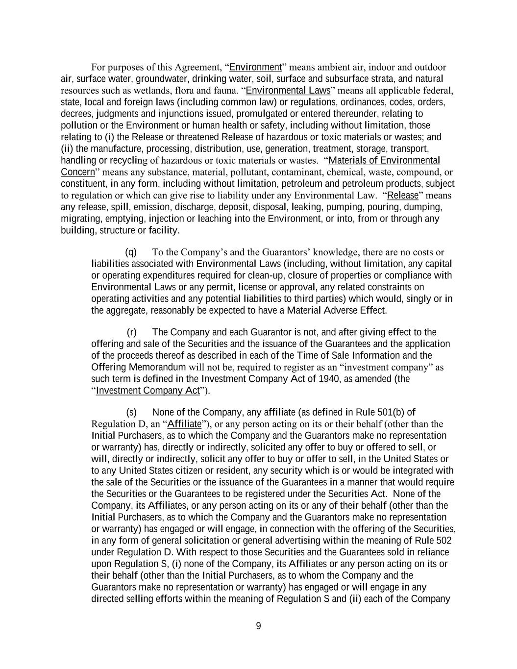 9 For purposes of this Agreement, “Environment” means ambient air, indoor and outdoor air, surface water, groundwater, drinking water, soil, surface and subsurface strata, and natural resources such as wetlands, flora and fauna. “Environmental Laws” means all applicable federal, state, local and foreign laws (including common law) or regulations, ordinances, codes, orders, decrees, judgments and injunctions issued, promulgated or entered thereunder, relating to pollution or the Environment or human health or safety, including without limitation, those relating to (i) the Release or threatened Release of hazardous or toxic materials or wastes; and (ii) the manufacture, processing, distribution, use, generation, treatment, storage, transport, handling or recycling of hazardous or toxic materials or wastes. “Materials of Environmental Concern” means any substance, material, pollutant, contaminant, chemical, waste, compound, or constituent, in any form, including without limitation, petroleum and petroleum products, subject to regulation or which can give rise to liability under any Environmental Law. “Release” means any release, spill, emission, discharge, deposit, disposal, leaking, pumping, pouring, dumping, migrating, emptying, injection or leaching into the Environment, or into, from or through any building, structure or facility. (q) To the Company’s and the Guarantors’ knowledge, there are no costs or liabilities associated with Environmental Laws (including, without limitation, any capital or operating expenditures required for clean-up, closure of properties or compliance with Environmental Laws or any permit, license or approval, any related constraints on operating activities and any potential liabilities to third parties) which would, singly or in the aggregate, reasonably be expected to have a Material Adverse Effect. (r) The Company and each Guarantor is not, and after giving effect to the offering and sale of the Securities and the issuance of the Guarantees and the application of the proceeds thereof as described in each of the Time of Sale Information and the Offering Memorandum will not be, required to register as an “investment company” as such term is defined in the Investment Company Act of 1940, as amended (the “Investment Company Act”). (s) None of the Company, any affiliate (as defined in Rule 501(b) of Regulation D, an “Affiliate”), or any person acting on its or their behalf (other than the Initial Purchasers, as to which the Company and the Guarantors make no representation or warranty) has, directly or indirectly, solicited any offer to buy or offered to sell, or will, directly or indirectly, solicit any offer to buy or offer to sell, in the United States or to any United States citizen or resident, any security which is or would be integrated with the sale of the Securities or the issuance of the Guarantees in a manner that would require the Securities or the Guarantees to be registered under the Securities Act. None of the Company, its Affiliates, or any person acting on its or any of their behalf (other than the Initial Purchasers, as to which the Company and the Guarantors make no representation or warranty) has engaged or will engage, in connection with the offering of the Securities, in any form of general solicitation or general advertising within the meaning of Rule 502 under Regulation D. With respect to those Securities and the Guarantees sold in reliance upon Regulation S, (i) none of the Company, its Affiliates or any person acting on its or their behalf (other than the Initial Purchasers, as to whom the Company and the Guarantors make no representation or warranty) has engaged or will engage in any directed selling efforts within the meaning of Regulation S and (ii) each of the Company
