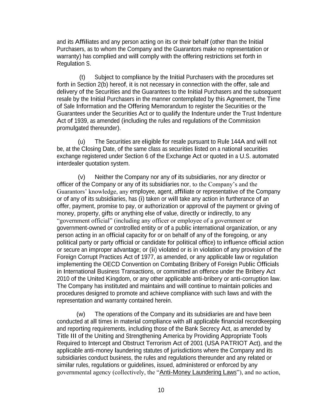 10 and its Affiliates and any person acting on its or their behalf (other than the Initial Purchasers, as to whom the Company and the Guarantors make no representation or warranty) has complied and will comply with the offering restrictions set forth in Regulation S. (t) Subject to compliance by the Initial Purchasers with the procedures set forth in Section 2(b) hereof, it is not necessary in connection with the offer, sale and delivery of the Securities and the Guarantees to the Initial Purchasers and the subsequent resale by the Initial Purchasers in the manner contemplated by this Agreement, the Time of Sale Information and the Offering Memorandum to register the Securities or the Guarantees under the Securities Act or to qualify the Indenture under the Trust Indenture Act of 1939, as amended (including the rules and regulations of the Commission promulgated thereunder). (u) The Securities are eligible for resale pursuant to Rule 144A and will not be, at the Closing Date, of the same class as securities listed on a national securities exchange registered under Section 6 of the Exchange Act or quoted in a U.S. automated interdealer quotation system. (v) Neither the Company nor any of its subsidiaries, nor any director or officer of the Company or any of its subsidiaries nor, to the Company’s and the Guarantors’ knowledge, any employee, agent, affiliate or representative of the Company or of any of its subsidiaries, has (i) taken or will take any action in furtherance of an offer, payment, promise to pay, or authorization or approval of the payment or giving of money, property, gifts or anything else of value, directly or indirectly, to any “government official” (including any officer or employee of a government or government-owned or controlled entity or of a public international organization, or any person acting in an official capacity for or on behalf of any of the foregoing, or any political party or party official or candidate for political office) to influence official action or secure an improper advantage; or (ii) violated or is in violation of any provision of the Foreign Corrupt Practices Act of 1977, as amended, or any applicable law or regulation implementing the OECD Convention on Combating Bribery of Foreign Public Officials in International Business Transactions, or committed an offence under the Bribery Act 2010 of the United Kingdom, or any other applicable anti-bribery or anti-corruption law. The Company has instituted and maintains and will continue to maintain policies and procedures designed to promote and achieve compliance with such laws and with the representation and warranty contained herein. (w) The operations of the Company and its subsidiaries are and have been conducted at all times in material compliance with all applicable financial recordkeeping and reporting requirements, including those of the Bank Secrecy Act, as amended by Title III of the Uniting and Strengthening America by Providing Appropriate Tools Required to Intercept and Obstruct Terrorism Act of 2001 (USA PATRIOT Act), and the applicable anti-money laundering statutes of jurisdictions where the Company and its subsidiaries conduct business, the rules and regulations thereunder and any related or similar rules, regulations or guidelines, issued, administered or enforced by any governmental agency (collectively, the “Anti-Money Laundering Laws”), and no action,