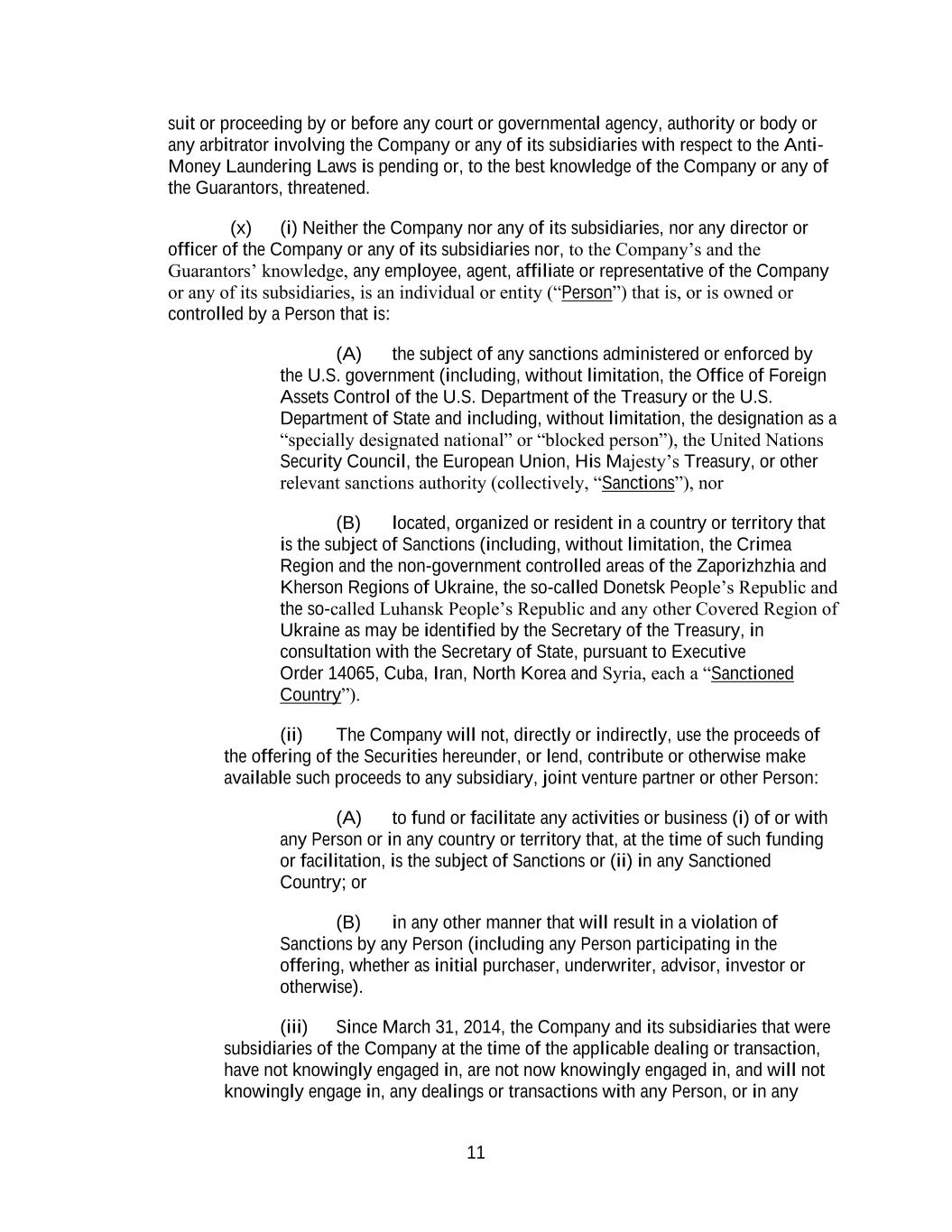 11 suit or proceeding by or before any court or governmental agency, authority or body or any arbitrator involving the Company or any of its subsidiaries with respect to the Anti- Money Laundering Laws is pending or, to the best knowledge of the Company or any of the Guarantors, threatened. (x) (i) Neither the Company nor any of its subsidiaries, nor any director or officer of the Company or any of its subsidiaries nor, to the Company’s and the Guarantors’ knowledge, any employee, agent, affiliate or representative of the Company or any of its subsidiaries, is an individual or entity (“Person”) that is, or is owned or controlled by a Person that is: (A) the subject of any sanctions administered or enforced by the U.S. government (including, without limitation, the Office of Foreign Assets Control of the U.S. Department of the Treasury or the U.S. Department of State and including, without limitation, the designation as a “specially designated national” or “blocked person”), the United Nations Security Council, the European Union, His Majesty’s Treasury, or other relevant sanctions authority (collectively, “Sanctions”), nor (B) located, organized or resident in a country or territory that is the subject of Sanctions (including, without limitation, the Crimea Region and the non-government controlled areas of the Zaporizhzhia and Kherson Regions of Ukraine, the so-called Donetsk People’s Republic and the so-called Luhansk People’s Republic and any other Covered Region of Ukraine as may be identified by the Secretary of the Treasury, in consultation with the Secretary of State, pursuant to Executive Order 14065, Cuba, Iran, North Korea and Syria, each a “Sanctioned Country”). (ii) The Company will not, directly or indirectly, use the proceeds of the offering of the Securities hereunder, or lend, contribute or otherwise make available such proceeds to any subsidiary, joint venture partner or other Person: (A) to fund or facilitate any activities or business (i) of or with any Person or in any country or territory that, at the time of such funding or facilitation, is the subject of Sanctions or (ii) in any Sanctioned Country; or (B) in any other manner that will result in a violation of Sanctions by any Person (including any Person participating in the offering, whether as initial purchaser, underwriter, advisor, investor or otherwise). (iii) Since March 31, 2014, the Company and its subsidiaries that were subsidiaries of the Company at the time of the applicable dealing or transaction, have not knowingly engaged in, are not now knowingly engaged in, and will not knowingly engage in, any dealings or transactions with any Person, or in any