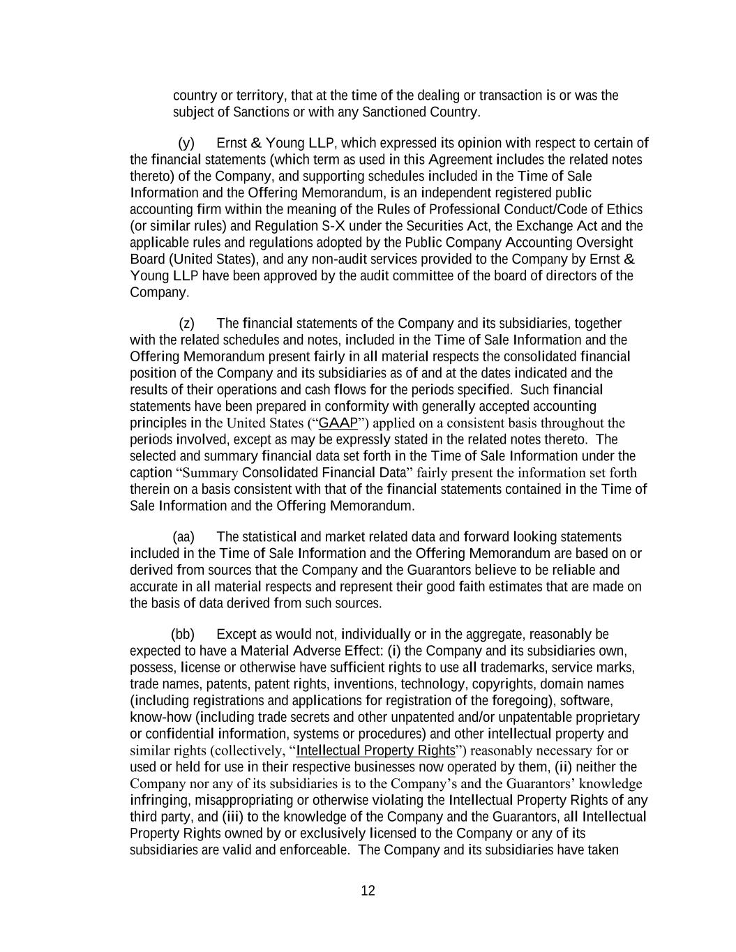 12 country or territory, that at the time of the dealing or transaction is or was the subject of Sanctions or with any Sanctioned Country. (y) Ernst & Young LLP, which expressed its opinion with respect to certain of the financial statements (which term as used in this Agreement includes the related notes thereto) of the Company, and supporting schedules included in the Time of Sale Information and the Offering Memorandum, is an independent registered public accounting firm within the meaning of the Rules of Professional Conduct/Code of Ethics (or similar rules) and Regulation S-X under the Securities Act, the Exchange Act and the applicable rules and regulations adopted by the Public Company Accounting Oversight Board (United States), and any non-audit services provided to the Company by Ernst & Young LLP have been approved by the audit committee of the board of directors of the Company. (z) The financial statements of the Company and its subsidiaries, together with the related schedules and notes, included in the Time of Sale Information and the Offering Memorandum present fairly in all material respects the consolidated financial position of the Company and its subsidiaries as of and at the dates indicated and the results of their operations and cash flows for the periods specified. Such financial statements have been prepared in conformity with generally accepted accounting principles in the United States (“GAAP”) applied on a consistent basis throughout the periods involved, except as may be expressly stated in the related notes thereto. The selected and summary financial data set forth in the Time of Sale Information under the caption “Summary Consolidated Financial Data” fairly present the information set forth therein on a basis consistent with that of the financial statements contained in the Time of Sale Information and the Offering Memorandum. (aa) The statistical and market related data and forward looking statements included in the Time of Sale Information and the Offering Memorandum are based on or derived from sources that the Company and the Guarantors believe to be reliable and accurate in all material respects and represent their good faith estimates that are made on the basis of data derived from such sources. (bb) Except as would not, individually or in the aggregate, reasonably be expected to have a Material Adverse Effect: (i) the Company and its subsidiaries own, possess, license or otherwise have sufficient rights to use all trademarks, service marks, trade names, patents, patent rights, inventions, technology, copyrights, domain names (including registrations and applications for registration of the foregoing), software, know-how (including trade secrets and other unpatented and/or unpatentable proprietary or confidential information, systems or procedures) and other intellectual property and similar rights (collectively, “Intellectual Property Rights”) reasonably necessary for or used or held for use in their respective businesses now operated by them, (ii) neither the Company nor any of its subsidiaries is to the Company’s and the Guarantors’ knowledge infringing, misappropriating or otherwise violating the Intellectual Property Rights of any third party, and (iii) to the knowledge of the Company and the Guarantors, all Intellectual Property Rights owned by or exclusively licensed to the Company or any of its subsidiaries are valid and enforceable. The Company and its subsidiaries have taken