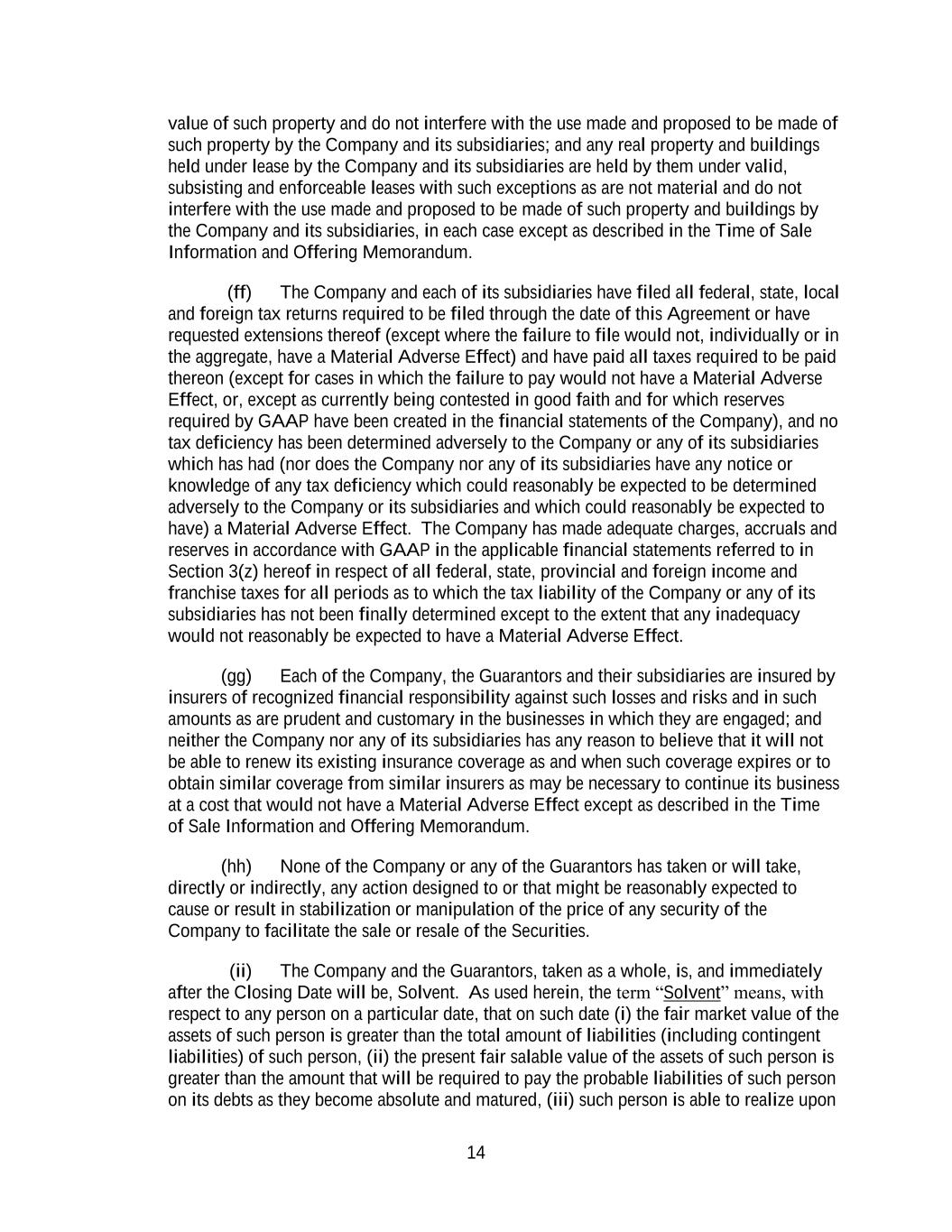 14 value of such property and do not interfere with the use made and proposed to be made of such property by the Company and its subsidiaries; and any real property and buildings held under lease by the Company and its subsidiaries are held by them under valid, subsisting and enforceable leases with such exceptions as are not material and do not interfere with the use made and proposed to be made of such property and buildings by the Company and its subsidiaries, in each case except as described in the Time of Sale Information and Offering Memorandum. (ff) The Company and each of its subsidiaries have filed all federal, state, local and foreign tax returns required to be filed through the date of this Agreement or have requested extensions thereof (except where the failure to file would not, individually or in the aggregate, have a Material Adverse Effect) and have paid all taxes required to be paid thereon (except for cases in which the failure to pay would not have a Material Adverse Effect, or, except as currently being contested in good faith and for which reserves required by GAAP have been created in the financial statements of the Company), and no tax deficiency has been determined adversely to the Company or any of its subsidiaries which has had (nor does the Company nor any of its subsidiaries have any notice or knowledge of any tax deficiency which could reasonably be expected to be determined adversely to the Company or its subsidiaries and which could reasonably be expected to have) a Material Adverse Effect. The Company has made adequate charges, accruals and reserves in accordance with GAAP in the applicable financial statements referred to in Section 3(z) hereof in respect of all federal, state, provincial and foreign income and franchise taxes for all periods as to which the tax liability of the Company or any of its subsidiaries has not been finally determined except to the extent that any inadequacy would not reasonably be expected to have a Material Adverse Effect. (gg) Each of the Company, the Guarantors and their subsidiaries are insured by insurers of recognized financial responsibility against such losses and risks and in such amounts as are prudent and customary in the businesses in which they are engaged; and neither the Company nor any of its subsidiaries has any reason to believe that it will not be able to renew its existing insurance coverage as and when such coverage expires or to obtain similar coverage from similar insurers as may be necessary to continue its business at a cost that would not have a Material Adverse Effect except as described in the Time of Sale Information and Offering Memorandum. (hh) None of the Company or any of the Guarantors has taken or will take, directly or indirectly, any action designed to or that might be reasonably expected to cause or result in stabilization or manipulation of the price of any security of the Company to facilitate the sale or resale of the Securities. (ii) The Company and the Guarantors, taken as a whole, is, and immediately after the Closing Date will be, Solvent. As used herein, the term “Solvent” means, with respect to any person on a particular date, that on such date (i) the fair market value of the assets of such person is greater than the total amount of liabilities (including contingent liabilities) of such person, (ii) the present fair salable value of the assets of such person is greater than the amount that will be required to pay the probable liabilities of such person on its debts as they become absolute and matured, (iii) such person is able to realize upon