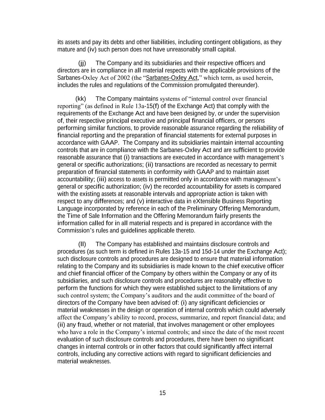 15 its assets and pay its debts and other liabilities, including contingent obligations, as they mature and (iv) such person does not have unreasonably small capital. (jj) The Company and its subsidiaries and their respective officers and directors are in compliance in all material respects with the applicable provisions of the Sarbanes-Oxley Act of 2002 (the “Sarbanes-Oxley Act,” which term, as used herein, includes the rules and regulations of the Commission promulgated thereunder). (kk) The Company maintains systems of “internal control over financial reporting” (as defined in Rule 13a-15(f) of the Exchange Act) that comply with the requirements of the Exchange Act and have been designed by, or under the supervision of, their respective principal executive and principal financial officers, or persons performing similar functions, to provide reasonable assurance regarding the reliability of financial reporting and the preparation of financial statements for external purposes in accordance with GAAP. The Company and its subsidiaries maintain internal accounting controls that are in compliance with the Sarbanes-Oxley Act and are sufficient to provide reasonable assurance that (i) transactions are executed in accordance with management’s general or specific authorizations; (ii) transactions are recorded as necessary to permit preparation of financial statements in conformity with GAAP and to maintain asset accountability; (iii) access to assets is permitted only in accordance with management’s general or specific authorization; (iv) the recorded accountability for assets is compared with the existing assets at reasonable intervals and appropriate action is taken with respect to any differences; and (v) interactive data in eXtensible Business Reporting Language incorporated by reference in each of the Preliminary Offering Memorandum, the Time of Sale Information and the Offering Memorandum fairly presents the information called for in all material respects and is prepared in accordance with the Commission’s rules and guidelines applicable thereto. (ll) The Company has established and maintains disclosure controls and procedures (as such term is defined in Rules 13a-15 and 15d-14 under the Exchange Act); such disclosure controls and procedures are designed to ensure that material information relating to the Company and its subsidiaries is made known to the chief executive officer and chief financial officer of the Company by others within the Company or any of its subsidiaries, and such disclosure controls and procedures are reasonably effective to perform the functions for which they were established subject to the limitations of any such control system; the Company’s auditors and the audit committee of the board of directors of the Company have been advised of: (i) any significant deficiencies or material weaknesses in the design or operation of internal controls which could adversely affect the Company’s ability to record, process, summarize, and report financial data; and (ii) any fraud, whether or not material, that involves management or other employees who have a role in the Company’s internal controls; and since the date of the most recent evaluation of such disclosure controls and procedures, there have been no significant changes in internal controls or in other factors that could significantly affect internal controls, including any corrective actions with regard to significant deficiencies and material weaknesses.