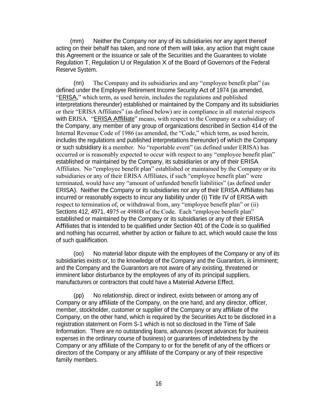 16 (mm) Neither the Company nor any of its subsidiaries nor any agent thereof acting on their behalf has taken, and none of them will take, any action that might cause this Agreement or the issuance or sale of the Securities and the Guarantees to violate Regulation T, Regulation U or Regulation X of the Board of Governors of the Federal Reserve System. (nn) The Company and its subsidiaries and any “employee benefit plan” (as defined under the Employee Retirement Income Security Act of 1974 (as amended, “ERISA,” which term, as used herein, includes the regulations and published interpretations thereunder) established or maintained by the Company and its subsidiaries or their “ERISA Affiliates” (as defined below) are in compliance in all material respects with ERISA. “ERISA Affiliate” means, with respect to the Company or a subsidiary of the Company, any member of any group of organizations described in Section 414 of the Internal Revenue Code of 1986 (as amended, the “Code,” which term, as used herein, includes the regulations and published interpretations thereunder) of which the Company or such subsidiary is a member. No “reportable event” (as defined under ERISA) has occurred or is reasonably expected to occur with respect to any “employee benefit plan” established or maintained by the Company, its subsidiaries or any of their ERISA Affiliates. No “employee benefit plan” established or maintained by the Company or its subsidiaries or any of their ERISA Affiliates, if such “employee benefit plan” were terminated, would have any “amount of unfunded benefit liabilities” (as defined under ERISA). Neither the Company or its subsidiaries nor any of their ERISA Affiliates has incurred or reasonably expects to incur any liability under (i) Title IV of ERISA with respect to termination of, or withdrawal from, any “employee benefit plan” or (ii) Sections 412, 4971, 4975 or 4980B of the Code. Each “employee benefit plan” established or maintained by the Company or its subsidiaries or any of their ERISA Affiliates that is intended to be qualified under Section 401 of the Code is so qualified and nothing has occurred, whether by action or failure to act, which would cause the loss of such qualification. (oo) No material labor dispute with the employees of the Company or any of its subsidiaries exists or, to the knowledge of the Company and the Guarantors, is imminent; and the Company and the Guarantors are not aware of any existing, threatened or imminent labor disturbance by the employees of any of its principal suppliers, manufacturers or contractors that could have a Material Adverse Effect. (pp) No relationship, direct or indirect, exists between or among any of Company or any affiliate of the Company, on the one hand, and any director, officer, member, stockholder, customer or supplier of the Company or any affiliate of the Company, on the other hand, which is required by the Securities Act to be disclosed in a registration statement on Form S-1 which is not so disclosed in the Time of Sale Information. There are no outstanding loans, advances (except advances for business expenses in the ordinary course of business) or guarantees of indebtedness by the Company or any affiliate of the Company to or for the benefit of any of the officers or directors of the Company or any affiliate of the Company or any of their respective family members.