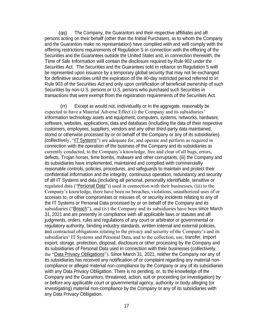 17 (qq) The Company, the Guarantors and their respective affiliates and all persons acting on their behalf (other than the Initial Purchasers, as to whom the Company and the Guarantors make no representation) have complied with and will comply with the offering restrictions requirements of Regulation S in connection with the offering of the Securities and the Guarantees outside the United States and, in connection therewith, the Time of Sale Information will contain the disclosure required by Rule 902 under the Securities Act. The Securities and the Guarantees sold in reliance on Regulation S will be represented upon issuance by a temporary global security that may not be exchanged for definitive securities until the expiration of the 40-day restricted period referred to in Rule 903 of the Securities Act and only upon certification of beneficial ownership of such Securities by non-U.S. persons or U.S. persons who purchased such Securities in transactions that were exempt from the registration requirements of the Securities Act. (rr) Except as would not, individually or in the aggregate, reasonably be expected to have a Material Adverse Effect (i) the Company and its subsidiaries’ information technology assets and equipment, computers, systems, networks, hardware, software, websites, applications, data and databases (including the data of their respective customers, employees, suppliers, vendors and any other third-party data maintained, stored or otherwise processed by or on behalf of the Company or any of its subsidiaries) (collectively, “IT Systems”) are adequate for, and operate and perform as required in connection with the operation of the business of the Company and its subsidiaries as currently conducted, to the Company’s knowledge, free and clear of all bugs, errors, defects, Trojan horses, time bombs, malware and other corruptants, (ii) the Company and its subsidiaries have implemented, maintained and complied with commercially reasonable controls, policies, procedures, and safeguards to maintain and protect their confidential information and the integrity, continuous operation, redundancy and security of all IT Systems and data (including all personal, personally identifiable, sensitive or regulated data (“Personal Data”)) used in connection with their businesses, (iii) to the Company’s knowledge, there have been no breaches, violations, unauthorized uses of or accesses to, or other compromises or misuses of, or security incidents relating to any of the IT Systems or Personal Data processed by or on behalf of the Company and its subsidiaries (“Breach”), and (iv) the Company and its subsidiaries have been since March 31, 2021 and are presently in compliance with all applicable laws or statutes and all judgments, orders, rules and regulations of any court or arbitrator or governmental or regulatory authority, binding industry standards, written internal and external policies, and contractual obligations relating to the privacy and security of the Company’s and its subsidiaries’ IT Systems and Personal Data, and to the collection, use, transfer, import export, storage, protection, disposal, disclosure or other processing by the Company and its subsidiaries of Personal Data used in connection with their businesses (collectively, the “Data Privacy Obligations”). Since March 31, 2021, neither the Company nor any of its subsidiaries has received any notification of or complaint regarding any material non- compliance or alleged material non-compliance by the Company or any of its subsidiaries with any Data Privacy Obligation. There is no pending, or, to the knowledge of the Company and the Guarantors, threatened, action, suit or proceeding (or investigation) by or before any applicable court or governmental agency, authority or body alleging (or investigating) material non-compliance by the Company or any of its subsidiaries with any Data Privacy Obligation.
