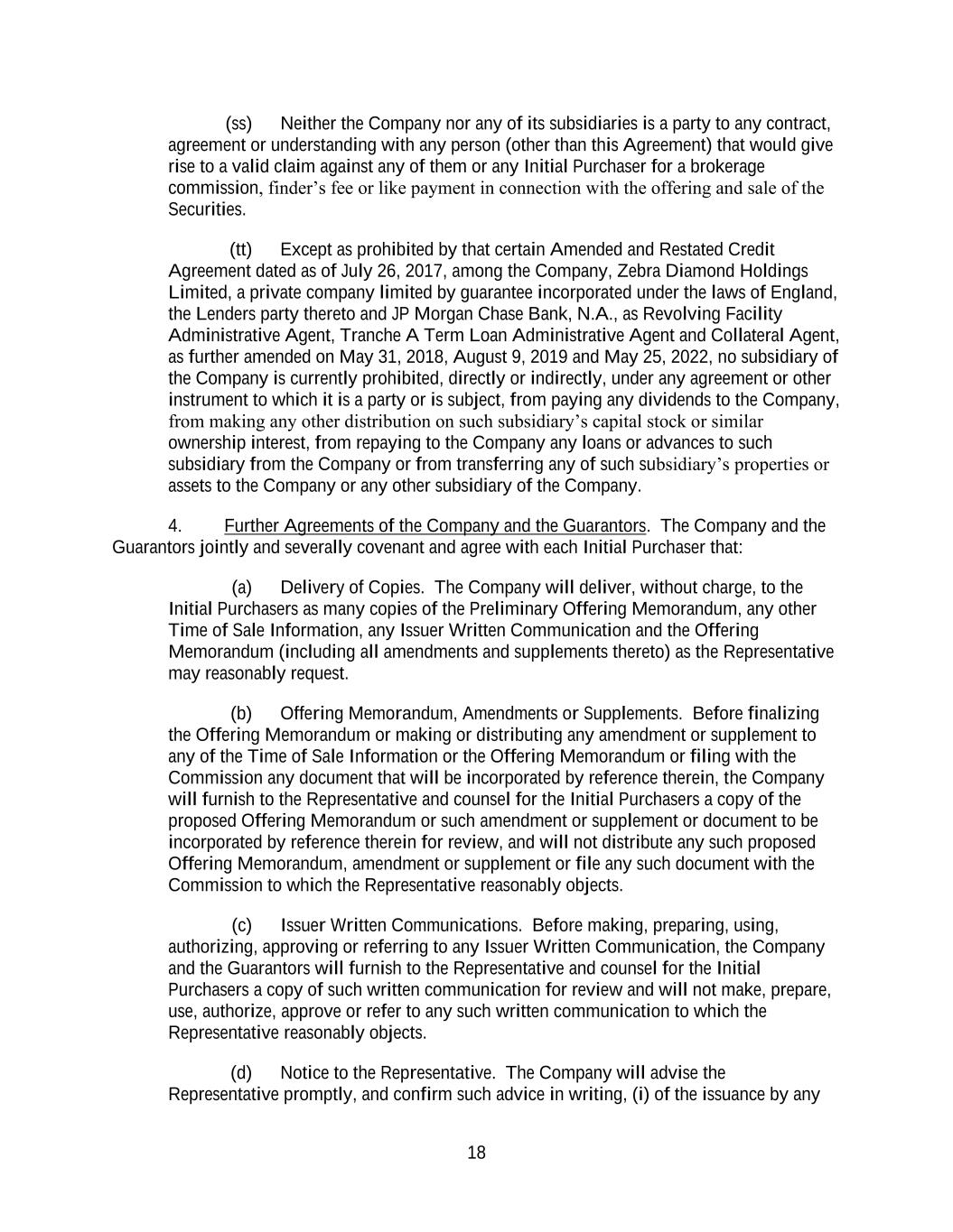 18 (ss) Neither the Company nor any of its subsidiaries is a party to any contract, agreement or understanding with any person (other than this Agreement) that would give rise to a valid claim against any of them or any Initial Purchaser for a brokerage commission, finder’s fee or like payment in connection with the offering and sale of the Securities. (tt) Except as prohibited by that certain Amended and Restated Credit Agreement dated as of July 26, 2017, among the Company, Zebra Diamond Holdings Limited, a private company limited by guarantee incorporated under the laws of England, the Lenders party thereto and JP Morgan Chase Bank, N.A., as Revolving Facility Administrative Agent, Tranche A Term Loan Administrative Agent and Collateral Agent, as further amended on May 31, 2018, August 9, 2019 and May 25, 2022, no subsidiary of the Company is currently prohibited, directly or indirectly, under any agreement or other instrument to which it is a party or is subject, from paying any dividends to the Company, from making any other distribution on such subsidiary’s capital stock or similar ownership interest, from repaying to the Company any loans or advances to such subsidiary from the Company or from transferring any of such subsidiary’s properties or assets to the Company or any other subsidiary of the Company. 4. Further Agreements of the Company and the Guarantors. The Company and the Guarantors jointly and severally covenant and agree with each Initial Purchaser that: (a) Delivery of Copies. The Company will deliver, without charge, to the Initial Purchasers as many copies of the Preliminary Offering Memorandum, any other Time of Sale Information, any Issuer Written Communication and the Offering Memorandum (including all amendments and supplements thereto) as the Representative may reasonably request. (b) Offering Memorandum, Amendments or Supplements. Before finalizing the Offering Memorandum or making or distributing any amendment or supplement to any of the Time of Sale Information or the Offering Memorandum or filing with the Commission any document that will be incorporated by reference therein, the Company will furnish to the Representative and counsel for the Initial Purchasers a copy of the proposed Offering Memorandum or such amendment or supplement or document to be incorporated by reference therein for review, and will not distribute any such proposed Offering Memorandum, amendment or supplement or file any such document with the Commission to which the Representative reasonably objects. (c) Issuer Written Communications. Before making, preparing, using, authorizing, approving or referring to any Issuer Written Communication, the Company and the Guarantors will furnish to the Representative and counsel for the Initial Purchasers a copy of such written communication for review and will not make, prepare, use, authorize, approve or refer to any such written communication to which the Representative reasonably objects. (d) Notice to the Representative. The Company will advise the Representative promptly, and confirm such advice in writing, (i) of the issuance by any