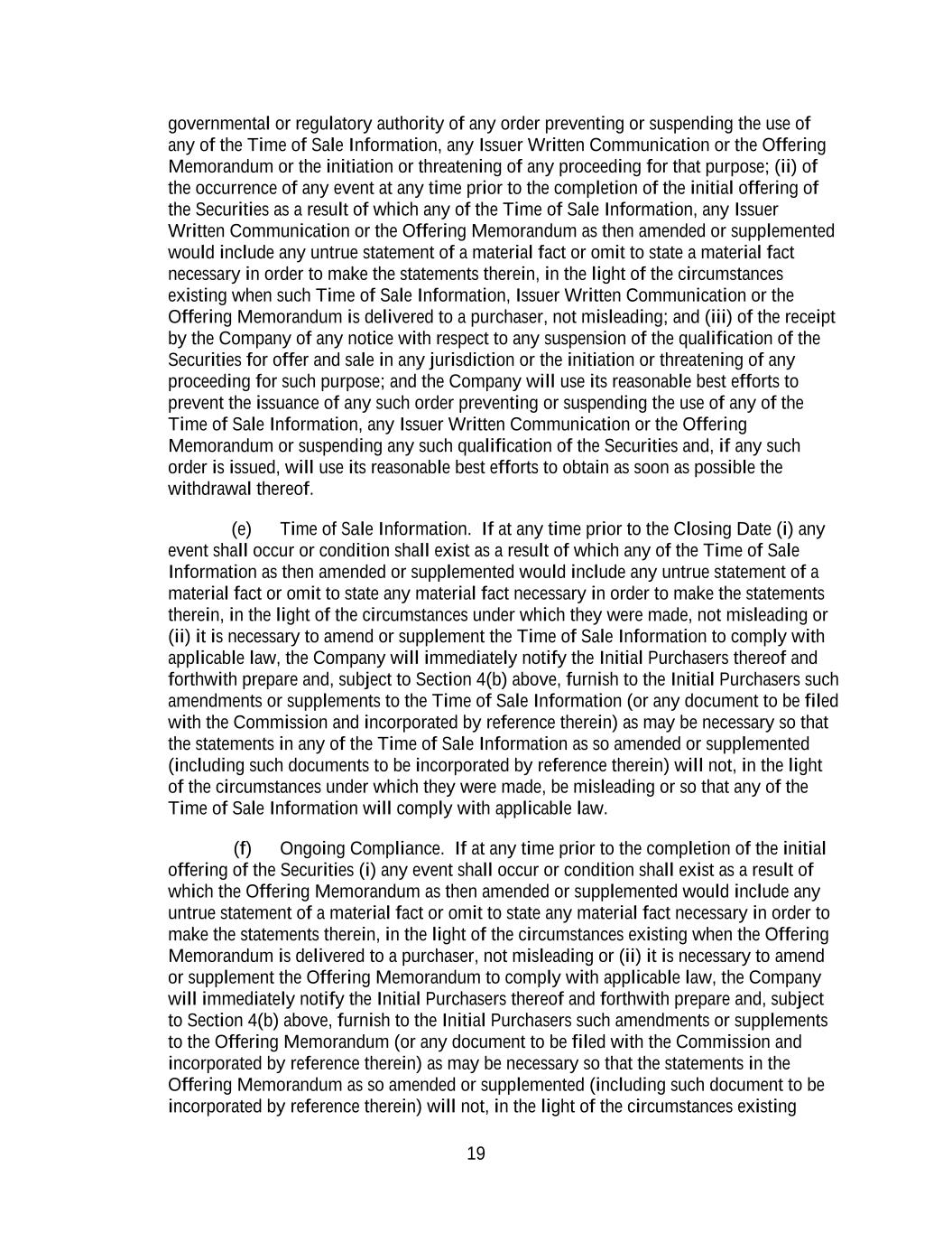 19 governmental or regulatory authority of any order preventing or suspending the use of any of the Time of Sale Information, any Issuer Written Communication or the Offering Memorandum or the initiation or threatening of any proceeding for that purpose; (ii) of the occurrence of any event at any time prior to the completion of the initial offering of the Securities as a result of which any of the Time of Sale Information, any Issuer Written Communication or the Offering Memorandum as then amended or supplemented would include any untrue statement of a material fact or omit to state a material fact necessary in order to make the statements therein, in the light of the circumstances existing when such Time of Sale Information, Issuer Written Communication or the Offering Memorandum is delivered to a purchaser, not misleading; and (iii) of the receipt by the Company of any notice with respect to any suspension of the qualification of the Securities for offer and sale in any jurisdiction or the initiation or threatening of any proceeding for such purpose; and the Company will use its reasonable best efforts to prevent the issuance of any such order preventing or suspending the use of any of the Time of Sale Information, any Issuer Written Communication or the Offering Memorandum or suspending any such qualification of the Securities and, if any such order is issued, will use its reasonable best efforts to obtain as soon as possible the withdrawal thereof. (e) Time of Sale Information. If at any time prior to the Closing Date (i) any event shall occur or condition shall exist as a result of which any of the Time of Sale Information as then amended or supplemented would include any untrue statement of a material fact or omit to state any material fact necessary in order to make the statements therein, in the light of the circumstances under which they were made, not misleading or (ii) it is necessary to amend or supplement the Time of Sale Information to comply with applicable law, the Company will immediately notify the Initial Purchasers thereof and forthwith prepare and, subject to Section 4(b) above, furnish to the Initial Purchasers such amendments or supplements to the Time of Sale Information (or any document to be filed with the Commission and incorporated by reference therein) as may be necessary so that the statements in any of the Time of Sale Information as so amended or supplemented (including such documents to be incorporated by reference therein) will not, in the light of the circumstances under which they were made, be misleading or so that any of the Time of Sale Information will comply with applicable law. (f) Ongoing Compliance. If at any time prior to the completion of the initial offering of the Securities (i) any event shall occur or condition shall exist as a result of which the Offering Memorandum as then amended or supplemented would include any untrue statement of a material fact or omit to state any material fact necessary in order to make the statements therein, in the light of the circumstances existing when the Offering Memorandum is delivered to a purchaser, not misleading or (ii) it is necessary to amend or supplement the Offering Memorandum to comply with applicable law, the Company will immediately notify the Initial Purchasers thereof and forthwith prepare and, subject to Section 4(b) above, furnish to the Initial Purchasers such amendments or supplements to the Offering Memorandum (or any document to be filed with the Commission and incorporated by reference therein) as may be necessary so that the statements in the Offering Memorandum as so amended or supplemented (including such document to be incorporated by reference therein) will not, in the light of the circumstances existing