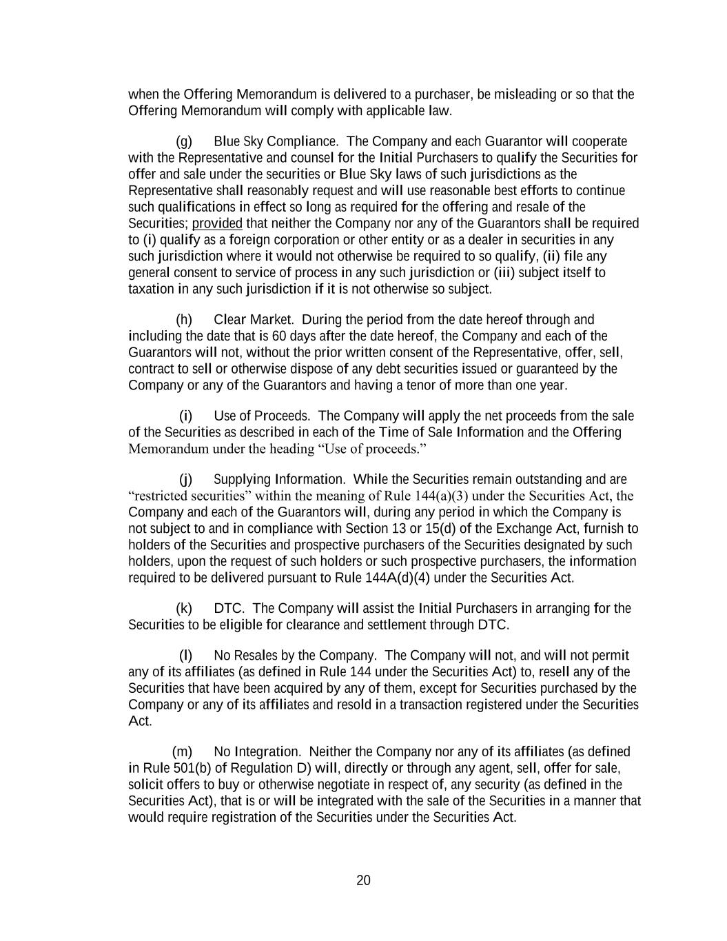 20 when the Offering Memorandum is delivered to a purchaser, be misleading or so that the Offering Memorandum will comply with applicable law. (g) Blue Sky Compliance. The Company and each Guarantor will cooperate with the Representative and counsel for the Initial Purchasers to qualify the Securities for offer and sale under the securities or Blue Sky laws of such jurisdictions as the Representative shall reasonably request and will use reasonable best efforts to continue such qualifications in effect so long as required for the offering and resale of the Securities; provided that neither the Company nor any of the Guarantors shall be required to (i) qualify as a foreign corporation or other entity or as a dealer in securities in any such jurisdiction where it would not otherwise be required to so qualify, (ii) file any general consent to service of process in any such jurisdiction or (iii) subject itself to taxation in any such jurisdiction if it is not otherwise so subject. (h) Clear Market. During the period from the date hereof through and including the date that is 60 days after the date hereof, the Company and each of the Guarantors will not, without the prior written consent of the Representative, offer, sell, contract to sell or otherwise dispose of any debt securities issued or guaranteed by the Company or any of the Guarantors and having a tenor of more than one year. (i) Use of Proceeds. The Company will apply the net proceeds from the sale of the Securities as described in each of the Time of Sale Information and the Offering Memorandum under the heading “Use of proceeds.” (j) Supplying Information. While the Securities remain outstanding and are “restricted securities” within the meaning of Rule 144(a)(3) under the Securities Act, the Company and each of the Guarantors will, during any period in which the Company is not subject to and in compliance with Section 13 or 15(d) of the Exchange Act, furnish to holders of the Securities and prospective purchasers of the Securities designated by such holders, upon the request of such holders or such prospective purchasers, the information required to be delivered pursuant to Rule 144A(d)(4) under the Securities Act. (k) DTC. The Company will assist the Initial Purchasers in arranging for the Securities to be eligible for clearance and settlement through DTC. (l) No Resales by the Company. The Company will not, and will not permit any of its affiliates (as defined in Rule 144 under the Securities Act) to, resell any of the Securities that have been acquired by any of them, except for Securities purchased by the Company or any of its affiliates and resold in a transaction registered under the Securities Act. (m) No Integration. Neither the Company nor any of its affiliates (as defined in Rule 501(b) of Regulation D) will, directly or through any agent, sell, offer for sale, solicit offers to buy or otherwise negotiate in respect of, any security (as defined in the Securities Act), that is or will be integrated with the sale of the Securities in a manner that would require registration of the Securities under the Securities Act.