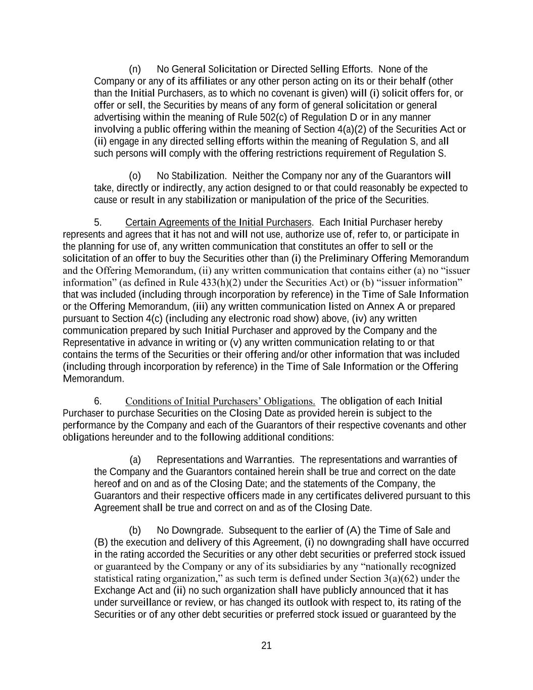 21 (n) No General Solicitation or Directed Selling Efforts. None of the Company or any of its affiliates or any other person acting on its or their behalf (other than the Initial Purchasers, as to which no covenant is given) will (i) solicit offers for, or offer or sell, the Securities by means of any form of general solicitation or general advertising within the meaning of Rule 502(c) of Regulation D or in any manner involving a public offering within the meaning of Section 4(a)(2) of the Securities Act or (ii) engage in any directed selling efforts within the meaning of Regulation S, and all such persons will comply with the offering restrictions requirement of Regulation S. (o) No Stabilization. Neither the Company nor any of the Guarantors will take, directly or indirectly, any action designed to or that could reasonably be expected to cause or result in any stabilization or manipulation of the price of the Securities. 5. Certain Agreements of the Initial Purchasers. Each Initial Purchaser hereby represents and agrees that it has not and will not use, authorize use of, refer to, or participate in the planning for use of, any written communication that constitutes an offer to sell or the solicitation of an offer to buy the Securities other than (i) the Preliminary Offering Memorandum and the Offering Memorandum, (ii) any written communication that contains either (a) no “issuer information” (as defined in Rule 433(h)(2) under the Securities Act) or (b) “issuer information” that was included (including through incorporation by reference) in the Time of Sale Information or the Offering Memorandum, (iii) any written communication listed on Annex A or prepared pursuant to Section 4(c) (including any electronic road show) above, (iv) any written communication prepared by such Initial Purchaser and approved by the Company and the Representative in advance in writing or (v) any written communication relating to or that contains the terms of the Securities or their offering and/or other information that was included (including through incorporation by reference) in the Time of Sale Information or the Offering Memorandum. 6. Conditions of Initial Purchasers’ Obligations. The obligation of each Initial Purchaser to purchase Securities on the Closing Date as provided herein is subject to the performance by the Company and each of the Guarantors of their respective covenants and other obligations hereunder and to the following additional conditions: (a) Representations and Warranties. The representations and warranties of the Company and the Guarantors contained herein shall be true and correct on the date hereof and on and as of the Closing Date; and the statements of the Company, the Guarantors and their respective officers made in any certificates delivered pursuant to this Agreement shall be true and correct on and as of the Closing Date. (b) No Downgrade. Subsequent to the earlier of (A) the Time of Sale and (B) the execution and delivery of this Agreement, (i) no downgrading shall have occurred in the rating accorded the Securities or any other debt securities or preferred stock issued or guaranteed by the Company or any of its subsidiaries by any “nationally recognized statistical rating organization,” as such term is defined under Section 3(a)(62) under the Exchange Act and (ii) no such organization shall have publicly announced that it has under surveillance or review, or has changed its outlook with respect to, its rating of the Securities or of any other debt securities or preferred stock issued or guaranteed by the
