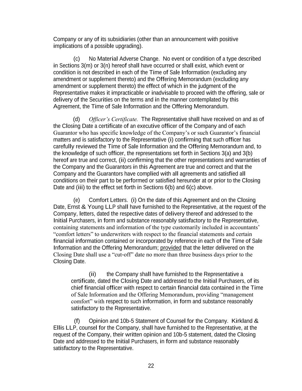 22 Company or any of its subsidiaries (other than an announcement with positive implications of a possible upgrading). (c) No Material Adverse Change. No event or condition of a type described in Sections 3(m) or 3(n) hereof shall have occurred or shall exist, which event or condition is not described in each of the Time of Sale Information (excluding any amendment or supplement thereto) and the Offering Memorandum (excluding any amendment or supplement thereto) the effect of which in the judgment of the Representative makes it impracticable or inadvisable to proceed with the offering, sale or delivery of the Securities on the terms and in the manner contemplated by this Agreement, the Time of Sale Information and the Offering Memorandum. (d) Officer’s Certificate. The Representative shall have received on and as of the Closing Date a certificate of an executive officer of the Company and of each Guarantor who has specific knowledge of the Company’s or such Guarantor’s financial matters and is satisfactory to the Representative (i) confirming that such officer has carefully reviewed the Time of Sale Information and the Offering Memorandum and, to the knowledge of such officer, the representations set forth in Sections 3(a) and 3(b) hereof are true and correct, (ii) confirming that the other representations and warranties of the Company and the Guarantors in this Agreement are true and correct and that the Company and the Guarantors have complied with all agreements and satisfied all conditions on their part to be performed or satisfied hereunder at or prior to the Closing Date and (iii) to the effect set forth in Sections 6(b) and 6(c) above. (e) Comfort Letters. (i) On the date of this Agreement and on the Closing Date, Ernst & Young LLP shall have furnished to the Representative, at the request of the Company, letters, dated the respective dates of delivery thereof and addressed to the Initial Purchasers, in form and substance reasonably satisfactory to the Representative, containing statements and information of the type customarily included in accountants’ “comfort letters” to underwriters with respect to the financial statements and certain financial information contained or incorporated by reference in each of the Time of Sale Information and the Offering Memorandum; provided that the letter delivered on the Closing Date shall use a “cut-off” date no more than three business days prior to the Closing Date. (ii) the Company shall have furnished to the Representative a certificate, dated the Closing Date and addressed to the Initial Purchasers, of its chief financial officer with respect to certain financial data contained in the Time of Sale Information and the Offering Memorandum, providing “management comfort” with respect to such information, in form and substance reasonably satisfactory to the Representative. (f) Opinion and 10b-5 Statement of Counsel for the Company. Kirkland & Ellis LLP, counsel for the Company, shall have furnished to the Representative, at the request of the Company, their written opinion and 10b-5 statement, dated the Closing Date and addressed to the Initial Purchasers, in form and substance reasonably satisfactory to the Representative.