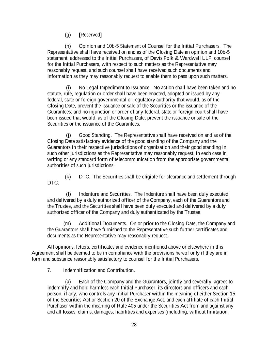 23 (g) [Reserved] (h) Opinion and 10b-5 Statement of Counsel for the Initial Purchasers. The Representative shall have received on and as of the Closing Date an opinion and 10b-5 statement, addressed to the Initial Purchasers, of Davis Polk & Wardwell LLP, counsel for the Initial Purchasers, with respect to such matters as the Representative may reasonably request, and such counsel shall have received such documents and information as they may reasonably request to enable them to pass upon such matters. (i) No Legal Impediment to Issuance. No action shall have been taken and no statute, rule, regulation or order shall have been enacted, adopted or issued by any federal, state or foreign governmental or regulatory authority that would, as of the Closing Date, prevent the issuance or sale of the Securities or the issuance of the Guarantees; and no injunction or order of any federal, state or foreign court shall have been issued that would, as of the Closing Date, prevent the issuance or sale of the Securities or the issuance of the Guarantees. (j) Good Standing. The Representative shall have received on and as of the Closing Date satisfactory evidence of the good standing of the Company and the Guarantors in their respective jurisdictions of organization and their good standing in such other jurisdictions as the Representative may reasonably request, in each case in writing or any standard form of telecommunication from the appropriate governmental authorities of such jurisdictions. (k) DTC. The Securities shall be eligible for clearance and settlement through DTC. (l) Indenture and Securities. The Indenture shall have been duly executed and delivered by a duly authorized officer of the Company, each of the Guarantors and the Trustee, and the Securities shall have been duly executed and delivered by a duly authorized officer of the Company and duly authenticated by the Trustee. (m) Additional Documents. On or prior to the Closing Date, the Company and the Guarantors shall have furnished to the Representative such further certificates and documents as the Representative may reasonably request. All opinions, letters, certificates and evidence mentioned above or elsewhere in this Agreement shall be deemed to be in compliance with the provisions hereof only if they are in form and substance reasonably satisfactory to counsel for the Initial Purchasers. 7. Indemnification and Contribution. (a) Each of the Company and the Guarantors, jointly and severally, agrees to indemnify and hold harmless each Initial Purchaser, its directors and officers and each person, if any, who controls any Initial Purchaser within the meaning of either Section 15 of the Securities Act or Section 20 of the Exchange Act, and each affiliate of each Initial Purchaser within the meaning of Rule 405 under the Securities Act from and against any and all losses, claims, damages, liabilities and expenses (including, without limitation,