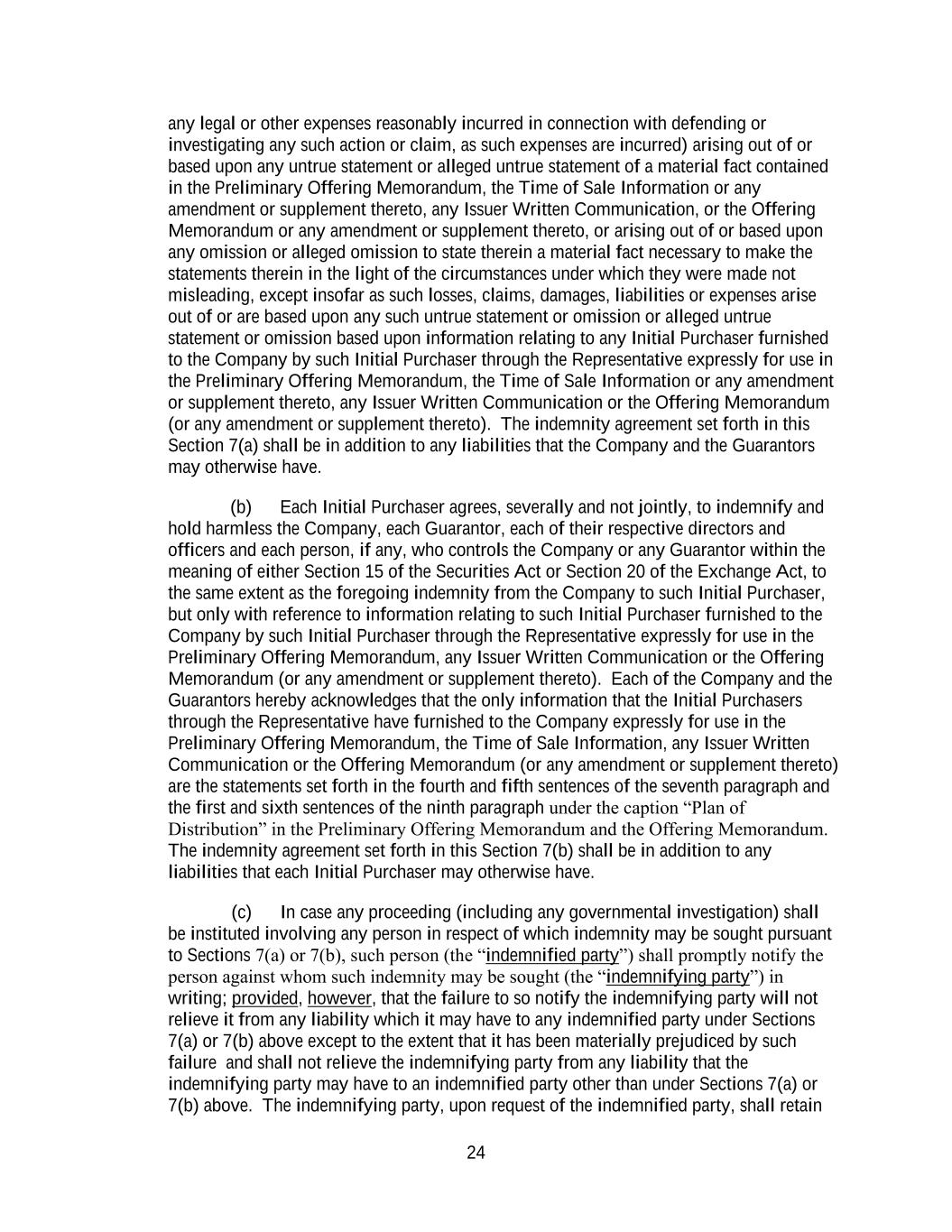 24 any legal or other expenses reasonably incurred in connection with defending or investigating any such action or claim, as such expenses are incurred) arising out of or based upon any untrue statement or alleged untrue statement of a material fact contained in the Preliminary Offering Memorandum, the Time of Sale Information or any amendment or supplement thereto, any Issuer Written Communication, or the Offering Memorandum or any amendment or supplement thereto, or arising out of or based upon any omission or alleged omission to state therein a material fact necessary to make the statements therein in the light of the circumstances under which they were made not misleading, except insofar as such losses, claims, damages, liabilities or expenses arise out of or are based upon any such untrue statement or omission or alleged untrue statement or omission based upon information relating to any Initial Purchaser furnished to the Company by such Initial Purchaser through the Representative expressly for use in the Preliminary Offering Memorandum, the Time of Sale Information or any amendment or supplement thereto, any Issuer Written Communication or the Offering Memorandum (or any amendment or supplement thereto). The indemnity agreement set forth in this Section 7(a) shall be in addition to any liabilities that the Company and the Guarantors may otherwise have. (b) Each Initial Purchaser agrees, severally and not jointly, to indemnify and hold harmless the Company, each Guarantor, each of their respective directors and officers and each person, if any, who controls the Company or any Guarantor within the meaning of either Section 15 of the Securities Act or Section 20 of the Exchange Act, to the same extent as the foregoing indemnity from the Company to such Initial Purchaser, but only with reference to information relating to such Initial Purchaser furnished to the Company by such Initial Purchaser through the Representative expressly for use in the Preliminary Offering Memorandum, any Issuer Written Communication or the Offering Memorandum (or any amendment or supplement thereto). Each of the Company and the Guarantors hereby acknowledges that the only information that the Initial Purchasers through the Representative have furnished to the Company expressly for use in the Preliminary Offering Memorandum, the Time of Sale Information, any Issuer Written Communication or the Offering Memorandum (or any amendment or supplement thereto) are the statements set forth in the fourth and fifth sentences of the seventh paragraph and the first and sixth sentences of the ninth paragraph under the caption “Plan of Distribution” in the Preliminary Offering Memorandum and the Offering Memorandum. The indemnity agreement set forth in this Section 7(b) shall be in addition to any liabilities that each Initial Purchaser may otherwise have. (c) In case any proceeding (including any governmental investigation) shall be instituted involving any person in respect of which indemnity may be sought pursuant to Sections 7(a) or 7(b), such person (the “indemnified party”) shall promptly notify the person against whom such indemnity may be sought (the “indemnifying party”) in writing; provided, however, that the failure to so notify the indemnifying party will not relieve it from any liability which it may have to any indemnified party under Sections 7(a) or 7(b) above except to the extent that it has been materially prejudiced by such failure and shall not relieve the indemnifying party from any liability that the indemnifying party may have to an indemnified party other than under Sections 7(a) or 7(b) above. The indemnifying party, upon request of the indemnified party, shall retain