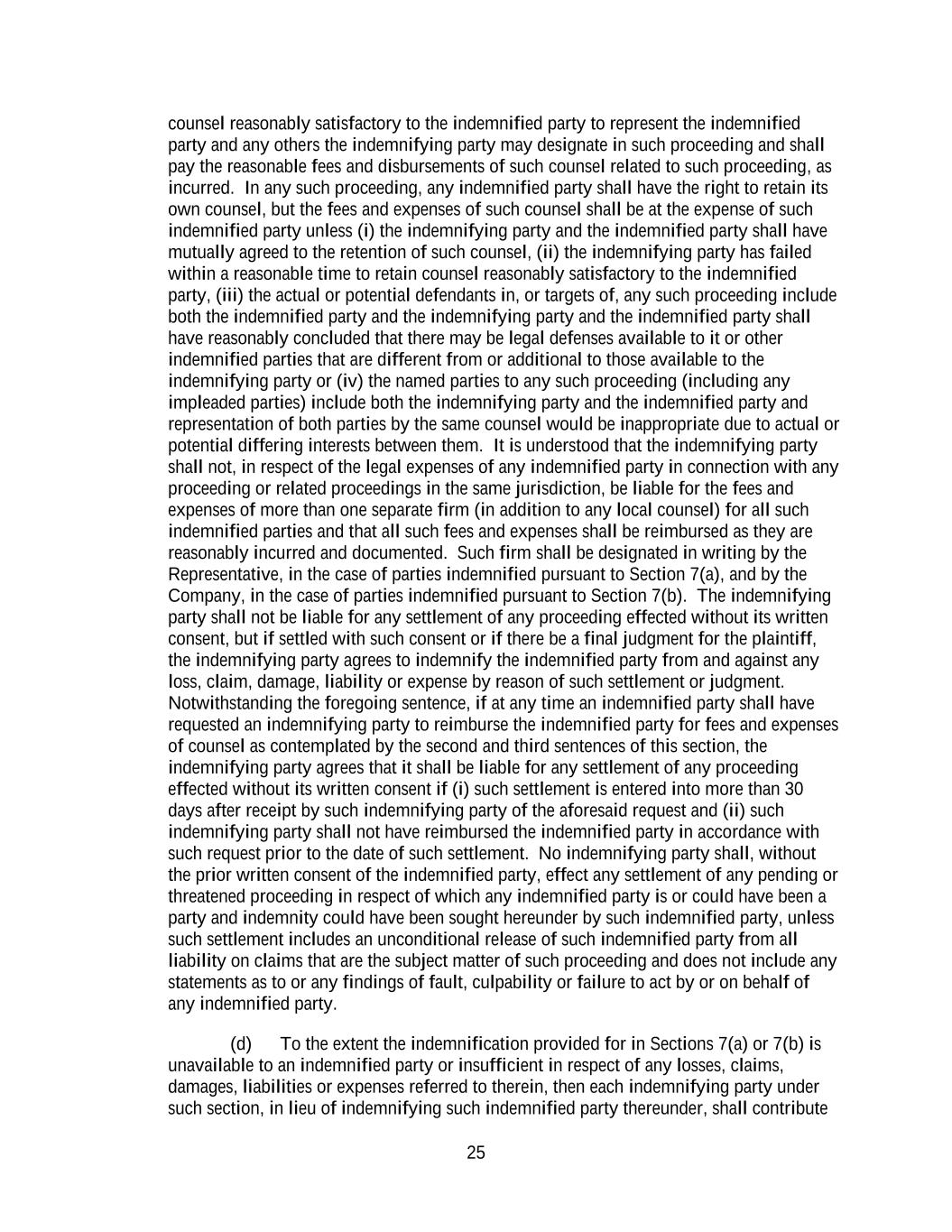 25 counsel reasonably satisfactory to the indemnified party to represent the indemnified party and any others the indemnifying party may designate in such proceeding and shall pay the reasonable fees and disbursements of such counsel related to such proceeding, as incurred. In any such proceeding, any indemnified party shall have the right to retain its own counsel, but the fees and expenses of such counsel shall be at the expense of such indemnified party unless (i) the indemnifying party and the indemnified party shall have mutually agreed to the retention of such counsel, (ii) the indemnifying party has failed within a reasonable time to retain counsel reasonably satisfactory to the indemnified party, (iii) the actual or potential defendants in, or targets of, any such proceeding include both the indemnified party and the indemnifying party and the indemnified party shall have reasonably concluded that there may be legal defenses available to it or other indemnified parties that are different from or additional to those available to the indemnifying party or (iv) the named parties to any such proceeding (including any impleaded parties) include both the indemnifying party and the indemnified party and representation of both parties by the same counsel would be inappropriate due to actual or potential differing interests between them. It is understood that the indemnifying party shall not, in respect of the legal expenses of any indemnified party in connection with any proceeding or related proceedings in the same jurisdiction, be liable for the fees and expenses of more than one separate firm (in addition to any local counsel) for all such indemnified parties and that all such fees and expenses shall be reimbursed as they are reasonably incurred and documented. Such firm shall be designated in writing by the Representative, in the case of parties indemnified pursuant to Section 7(a), and by the Company, in the case of parties indemnified pursuant to Section 7(b). The indemnifying party shall not be liable for any settlement of any proceeding effected without its written consent, but if settled with such consent or if there be a final judgment for the plaintiff, the indemnifying party agrees to indemnify the indemnified party from and against any loss, claim, damage, liability or expense by reason of such settlement or judgment. Notwithstanding the foregoing sentence, if at any time an indemnified party shall have requested an indemnifying party to reimburse the indemnified party for fees and expenses of counsel as contemplated by the second and third sentences of this section, the indemnifying party agrees that it shall be liable for any settlement of any proceeding effected without its written consent if (i) such settlement is entered into more than 30 days after receipt by such indemnifying party of the aforesaid request and (ii) such indemnifying party shall not have reimbursed the indemnified party in accordance with such request prior to the date of such settlement. No indemnifying party shall, without the prior written consent of the indemnified party, effect any settlement of any pending or threatened proceeding in respect of which any indemnified party is or could have been a party and indemnity could have been sought hereunder by such indemnified party, unless such settlement includes an unconditional release of such indemnified party from all liability on claims that are the subject matter of such proceeding and does not include any statements as to or any findings of fault, culpability or failure to act by or on behalf of any indemnified party. (d) To the extent the indemnification provided for in Sections 7(a) or 7(b) is unavailable to an indemnified party or insufficient in respect of any losses, claims, damages, liabilities or expenses referred to therein, then each indemnifying party under such section, in lieu of indemnifying such indemnified party thereunder, shall contribute