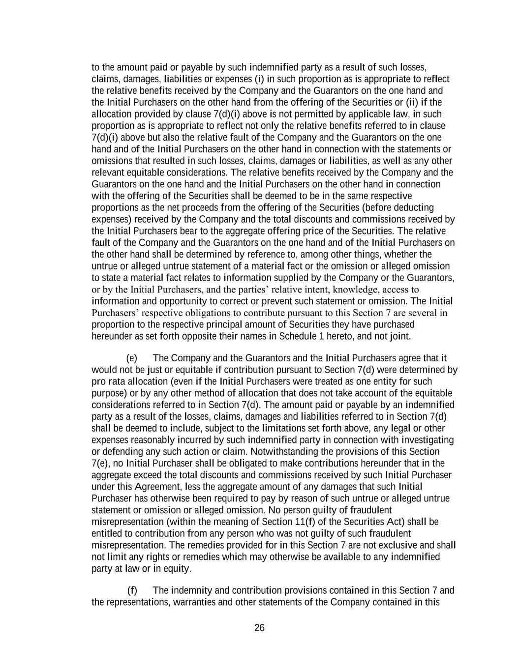 26 to the amount paid or payable by such indemnified party as a result of such losses, claims, damages, liabilities or expenses (i) in such proportion as is appropriate to reflect the relative benefits received by the Company and the Guarantors on the one hand and the Initial Purchasers on the other hand from the offering of the Securities or (ii) if the allocation provided by clause 7(d)(i) above is not permitted by applicable law, in such proportion as is appropriate to reflect not only the relative benefits referred to in clause 7(d)(i) above but also the relative fault of the Company and the Guarantors on the one hand and of the Initial Purchasers on the other hand in connection with the statements or omissions that resulted in such losses, claims, damages or liabilities, as well as any other relevant equitable considerations. The relative benefits received by the Company and the Guarantors on the one hand and the Initial Purchasers on the other hand in connection with the offering of the Securities shall be deemed to be in the same respective proportions as the net proceeds from the offering of the Securities (before deducting expenses) received by the Company and the total discounts and commissions received by the Initial Purchasers bear to the aggregate offering price of the Securities. The relative fault of the Company and the Guarantors on the one hand and of the Initial Purchasers on the other hand shall be determined by reference to, among other things, whether the untrue or alleged untrue statement of a material fact or the omission or alleged omission to state a material fact relates to information supplied by the Company or the Guarantors, or by the Initial Purchasers, and the parties’ relative intent, knowledge, access to information and opportunity to correct or prevent such statement or omission. The Initial Purchasers’ respective obligations to contribute pursuant to this Section 7 are several in proportion to the respective principal amount of Securities they have purchased hereunder as set forth opposite their names in Schedule 1 hereto, and not joint. (e) The Company and the Guarantors and the Initial Purchasers agree that it would not be just or equitable if contribution pursuant to Section 7(d) were determined by pro rata allocation (even if the Initial Purchasers were treated as one entity for such purpose) or by any other method of allocation that does not take account of the equitable considerations referred to in Section 7(d). The amount paid or payable by an indemnified party as a result of the losses, claims, damages and liabilities referred to in Section 7(d) shall be deemed to include, subject to the limitations set forth above, any legal or other expenses reasonably incurred by such indemnified party in connection with investigating or defending any such action or claim. Notwithstanding the provisions of this Section 7(e), no Initial Purchaser shall be obligated to make contributions hereunder that in the aggregate exceed the total discounts and commissions received by such Initial Purchaser under this Agreement, less the aggregate amount of any damages that such Initial Purchaser has otherwise been required to pay by reason of such untrue or alleged untrue statement or omission or alleged omission. No person guilty of fraudulent misrepresentation (within the meaning of Section 11(f) of the Securities Act) shall be entitled to contribution from any person who was not guilty of such fraudulent misrepresentation. The remedies provided for in this Section 7 are not exclusive and shall not limit any rights or remedies which may otherwise be available to any indemnified party at law or in equity. (f) The indemnity and contribution provisions contained in this Section 7 and the representations, warranties and other statements of the Company contained in this