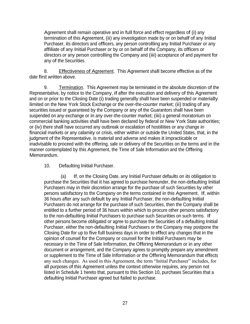 27 Agreement shall remain operative and in full force and effect regardless of (i) any termination of this Agreement, (ii) any investigation made by or on behalf of any Initial Purchaser, its directors and officers, any person controlling any Initial Purchaser or any affiliate of any Initial Purchaser or by or on behalf of the Company, its officers or directors or any person controlling the Company and (iii) acceptance of and payment for any of the Securities. 8. Effectiveness of Agreement. This Agreement shall become effective as of the date first written above. 9. Termination. This Agreement may be terminated in the absolute discretion of the Representative, by notice to the Company, if after the execution and delivery of this Agreement and on or prior to the Closing Date (i) trading generally shall have been suspended or materially limited on the New York Stock Exchange or the over-the-counter market; (ii) trading of any securities issued or guaranteed by the Company or any of the Guarantors shall have been suspended on any exchange or in any over-the-counter market; (iii) a general moratorium on commercial banking activities shall have been declared by federal or New York State authorities; or (iv) there shall have occurred any outbreak or escalation of hostilities or any change in financial markets or any calamity or crisis, either within or outside the United States, that, in the judgment of the Representative, is material and adverse and makes it impracticable or inadvisable to proceed with the offering, sale or delivery of the Securities on the terms and in the manner contemplated by this Agreement, the Time of Sale Information and the Offering Memorandum. 10. Defaulting Initial Purchaser. (a) If, on the Closing Date, any Initial Purchaser defaults on its obligation to purchase the Securities that it has agreed to purchase hereunder, the non-defaulting Initial Purchasers may in their discretion arrange for the purchase of such Securities by other persons satisfactory to the Company on the terms contained in this Agreement. If, within 36 hours after any such default by any Initial Purchaser, the non-defaulting Initial Purchasers do not arrange for the purchase of such Securities, then the Company shall be entitled to a further period of 36 hours within which to procure other persons satisfactory to the non-defaulting Initial Purchasers to purchase such Securities on such terms. If other persons become obligated or agree to purchase the Securities of a defaulting Initial Purchaser, either the non-defaulting Initial Purchasers or the Company may postpone the Closing Date for up to five full business days in order to effect any changes that in the opinion of counsel for the Company or counsel for the Initial Purchasers may be necessary in the Time of Sale Information, the Offering Memorandum or in any other document or arrangement, and the Company agrees to promptly prepare any amendment or supplement to the Time of Sale Information or the Offering Memorandum that effects any such changes. As used in this Agreement, the term “Initial Purchaser” includes, for all purposes of this Agreement unless the context otherwise requires, any person not listed in Schedule 1 hereto that, pursuant to this Section 10, purchases Securities that a defaulting Initial Purchaser agreed but failed to purchase.