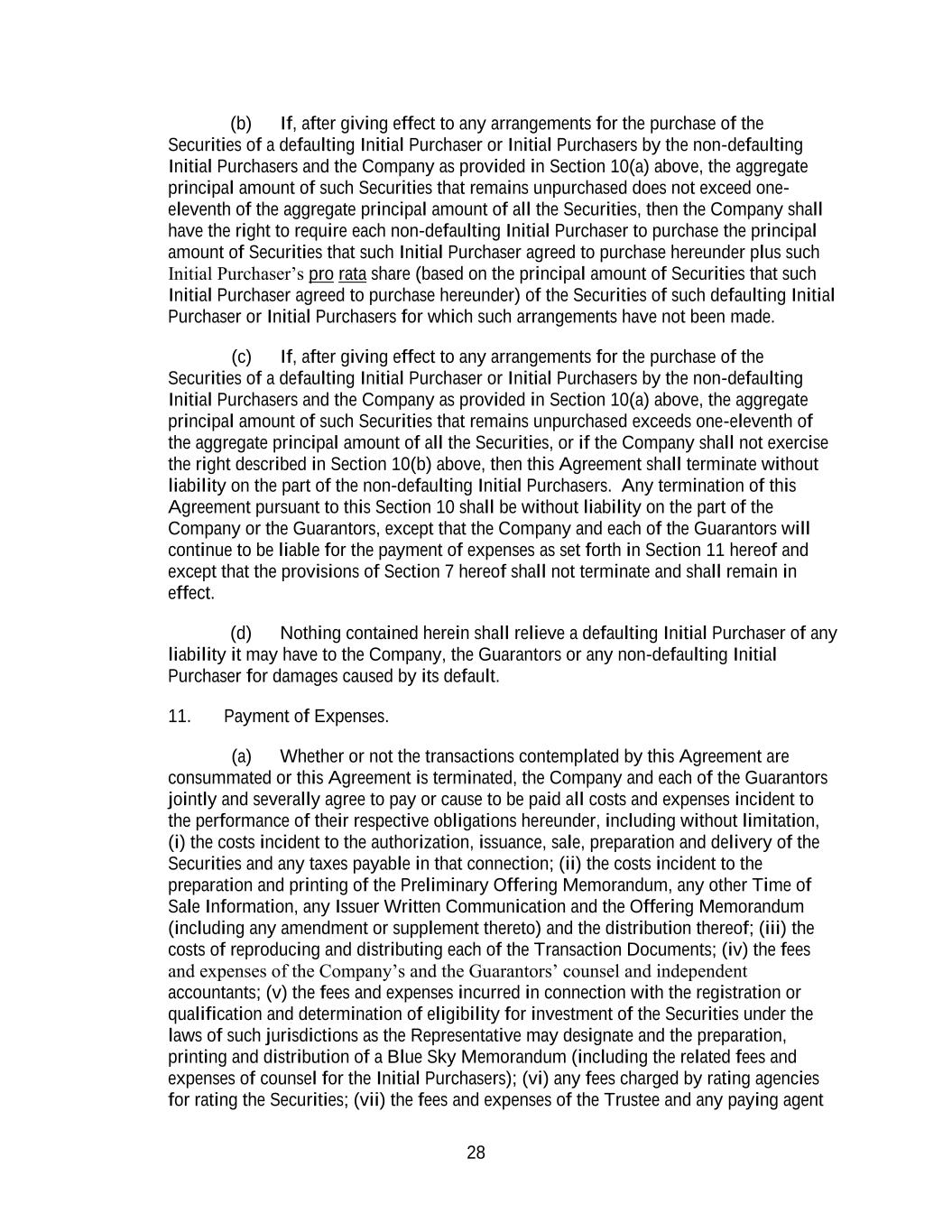 28 (b) If, after giving effect to any arrangements for the purchase of the Securities of a defaulting Initial Purchaser or Initial Purchasers by the non-defaulting Initial Purchasers and the Company as provided in Section 10(a) above, the aggregate principal amount of such Securities that remains unpurchased does not exceed one- eleventh of the aggregate principal amount of all the Securities, then the Company shall have the right to require each non-defaulting Initial Purchaser to purchase the principal amount of Securities that such Initial Purchaser agreed to purchase hereunder plus such Initial Purchaser’s pro rata share (based on the principal amount of Securities that such Initial Purchaser agreed to purchase hereunder) of the Securities of such defaulting Initial Purchaser or Initial Purchasers for which such arrangements have not been made. (c) If, after giving effect to any arrangements for the purchase of the Securities of a defaulting Initial Purchaser or Initial Purchasers by the non-defaulting Initial Purchasers and the Company as provided in Section 10(a) above, the aggregate principal amount of such Securities that remains unpurchased exceeds one-eleventh of the aggregate principal amount of all the Securities, or if the Company shall not exercise the right described in Section 10(b) above, then this Agreement shall terminate without liability on the part of the non-defaulting Initial Purchasers. Any termination of this Agreement pursuant to this Section 10 shall be without liability on the part of the Company or the Guarantors, except that the Company and each of the Guarantors will continue to be liable for the payment of expenses as set forth in Section 11 hereof and except that the provisions of Section 7 hereof shall not terminate and shall remain in effect. (d) Nothing contained herein shall relieve a defaulting Initial Purchaser of any liability it may have to the Company, the Guarantors or any non-defaulting Initial Purchaser for damages caused by its default. 11. Payment of Expenses. (a) Whether or not the transactions contemplated by this Agreement are consummated or this Agreement is terminated, the Company and each of the Guarantors jointly and severally agree to pay or cause to be paid all costs and expenses incident to the performance of their respective obligations hereunder, including without limitation, (i) the costs incident to the authorization, issuance, sale, preparation and delivery of the Securities and any taxes payable in that connection; (ii) the costs incident to the preparation and printing of the Preliminary Offering Memorandum, any other Time of Sale Information, any Issuer Written Communication and the Offering Memorandum (including any amendment or supplement thereto) and the distribution thereof; (iii) the costs of reproducing and distributing each of the Transaction Documents; (iv) the fees and expenses of the Company’s and the Guarantors’ counsel and independent accountants; (v) the fees and expenses incurred in connection with the registration or qualification and determination of eligibility for investment of the Securities under the laws of such jurisdictions as the Representative may designate and the preparation, printing and distribution of a Blue Sky Memorandum (including the related fees and expenses of counsel for the Initial Purchasers); (vi) any fees charged by rating agencies for rating the Securities; (vii) the fees and expenses of the Trustee and any paying agent