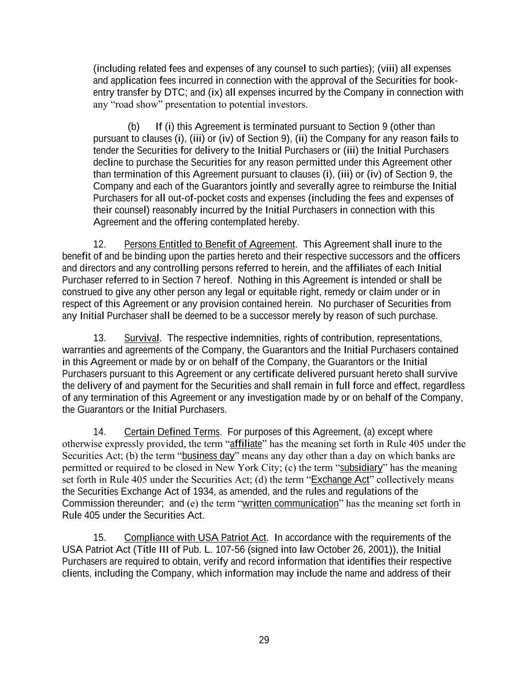 29 (including related fees and expenses of any counsel to such parties); (viii) all expenses and application fees incurred in connection with the approval of the Securities for book- entry transfer by DTC; and (ix) all expenses incurred by the Company in connection with any “road show” presentation to potential investors. (b) If (i) this Agreement is terminated pursuant to Section 9 (other than pursuant to clauses (i), (iii) or (iv) of Section 9), (ii) the Company for any reason fails to tender the Securities for delivery to the Initial Purchasers or (iii) the Initial Purchasers decline to purchase the Securities for any reason permitted under this Agreement other than termination of this Agreement pursuant to clauses (i), (iii) or (iv) of Section 9, the Company and each of the Guarantors jointly and severally agree to reimburse the Initial Purchasers for all out-of-pocket costs and expenses (including the fees and expenses of their counsel) reasonably incurred by the Initial Purchasers in connection with this Agreement and the offering contemplated hereby. 12. Persons Entitled to Benefit of Agreement. This Agreement shall inure to the benefit of and be binding upon the parties hereto and their respective successors and the officers and directors and any controlling persons referred to herein, and the affiliates of each Initial Purchaser referred to in Section 7 hereof. Nothing in this Agreement is intended or shall be construed to give any other person any legal or equitable right, remedy or claim under or in respect of this Agreement or any provision contained herein. No purchaser of Securities from any Initial Purchaser shall be deemed to be a successor merely by reason of such purchase. 13. Survival. The respective indemnities, rights of contribution, representations, warranties and agreements of the Company, the Guarantors and the Initial Purchasers contained in this Agreement or made by or on behalf of the Company, the Guarantors or the Initial Purchasers pursuant to this Agreement or any certificate delivered pursuant hereto shall survive the delivery of and payment for the Securities and shall remain in full force and effect, regardless of any termination of this Agreement or any investigation made by or on behalf of the Company, the Guarantors or the Initial Purchasers. 14. Certain Defined Terms. For purposes of this Agreement, (a) except where otherwise expressly provided, the term “affiliate” has the meaning set forth in Rule 405 under the Securities Act; (b) the term “business day” means any day other than a day on which banks are permitted or required to be closed in New York City; (c) the term “subsidiary” has the meaning set forth in Rule 405 under the Securities Act; (d) the term “Exchange Act” collectively means the Securities Exchange Act of 1934, as amended, and the rules and regulations of the Commission thereunder; and (e) the term “written communication” has the meaning set forth in Rule 405 under the Securities Act. 15. Compliance with USA Patriot Act. In accordance with the requirements of the USA Patriot Act (Title III of Pub. L. 107-56 (signed into law October 26, 2001)), the Initial Purchasers are required to obtain, verify and record information that identifies their respective clients, including the Company, which information may include the name and address of their