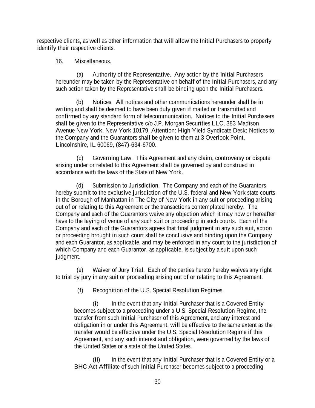 30 respective clients, as well as other information that will allow the Initial Purchasers to properly identify their respective clients. 16. Miscellaneous. (a) Authority of the Representative. Any action by the Initial Purchasers hereunder may be taken by the Representative on behalf of the Initial Purchasers, and any such action taken by the Representative shall be binding upon the Initial Purchasers. (b) Notices. All notices and other communications hereunder shall be in writing and shall be deemed to have been duly given if mailed or transmitted and confirmed by any standard form of telecommunication. Notices to the Initial Purchasers shall be given to the Representative c/o J.P. Morgan Securities LLC, 383 Madison Avenue New York, New York 10179, Attention: High Yield Syndicate Desk; Notices to the Company and the Guarantors shall be given to them at 3 Overlook Point, Lincolnshire, IL 60069, (847)-634-6700. (c) Governing Law. This Agreement and any claim, controversy or dispute arising under or related to this Agreement shall be governed by and construed in accordance with the laws of the State of New York. (d) Submission to Jurisdiction. The Company and each of the Guarantors hereby submit to the exclusive jurisdiction of the U.S. federal and New York state courts in the Borough of Manhattan in The City of New York in any suit or proceeding arising out of or relating to this Agreement or the transactions contemplated hereby. The Company and each of the Guarantors waive any objection which it may now or hereafter have to the laying of venue of any such suit or proceeding in such courts. Each of the Company and each of the Guarantors agrees that final judgment in any such suit, action or proceeding brought in such court shall be conclusive and binding upon the Company and each Guarantor, as applicable, and may be enforced in any court to the jurisdiction of which Company and each Guarantor, as applicable, is subject by a suit upon such judgment. (e) Waiver of Jury Trial. Each of the parties hereto hereby waives any right to trial by jury in any suit or proceeding arising out of or relating to this Agreement. (f) Recognition of the U.S. Special Resolution Regimes. (i) In the event that any Initial Purchaser that is a Covered Entity becomes subject to a proceeding under a U.S. Special Resolution Regime, the transfer from such Initial Purchaser of this Agreement, and any interest and obligation in or under this Agreement, will be effective to the same extent as the transfer would be effective under the U.S. Special Resolution Regime if this Agreement, and any such interest and obligation, were governed by the laws of the United States or a state of the United States. (ii) In the event that any Initial Purchaser that is a Covered Entity or a BHC Act Affiliate of such Initial Purchaser becomes subject to a proceeding