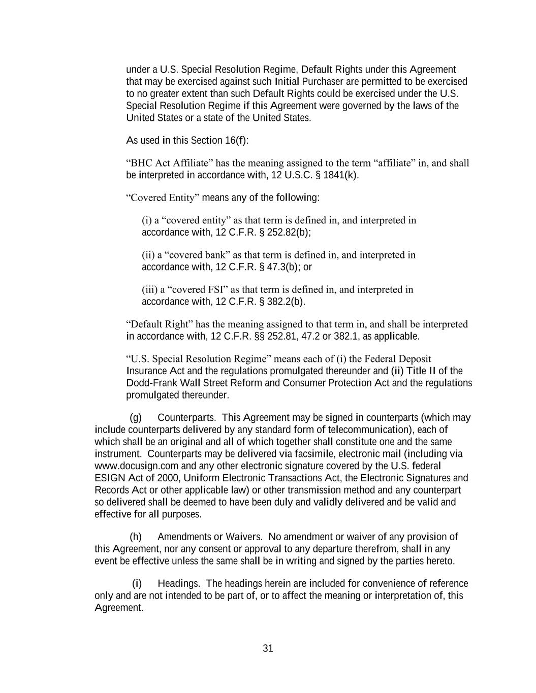 31 under a U.S. Special Resolution Regime, Default Rights under this Agreement that may be exercised against such Initial Purchaser are permitted to be exercised to no greater extent than such Default Rights could be exercised under the U.S. Special Resolution Regime if this Agreement were governed by the laws of the United States or a state of the United States. As used in this Section 16(f): “BHC Act Affiliate” has the meaning assigned to the term “affiliate” in, and shall be interpreted in accordance with, 12 U.S.C. § 1841(k). “Covered Entity” means any of the following: (i) a “covered entity” as that term is defined in, and interpreted in accordance with, 12 C.F.R. § 252.82(b); (ii) a “covered bank” as that term is defined in, and interpreted in accordance with, 12 C.F.R. § 47.3(b); or (iii) a “covered FSI” as that term is defined in, and interpreted in accordance with, 12 C.F.R. § 382.2(b). “Default Right” has the meaning assigned to that term in, and shall be interpreted in accordance with, 12 C.F.R. §§ 252.81, 47.2 or 382.1, as applicable. “U.S. Special Resolution Regime” means each of (i) the Federal Deposit Insurance Act and the regulations promulgated thereunder and (ii) Title II of the Dodd-Frank Wall Street Reform and Consumer Protection Act and the regulations promulgated thereunder. (g) Counterparts. This Agreement may be signed in counterparts (which may include counterparts delivered by any standard form of telecommunication), each of which shall be an original and all of which together shall constitute one and the same instrument. Counterparts may be delivered via facsimile, electronic mail (including via www.docusign.com and any other electronic signature covered by the U.S. federal ESIGN Act of 2000, Uniform Electronic Transactions Act, the Electronic Signatures and Records Act or other applicable law) or other transmission method and any counterpart so delivered shall be deemed to have been duly and validly delivered and be valid and effective for all purposes. (h) Amendments or Waivers. No amendment or waiver of any provision of this Agreement, nor any consent or approval to any departure therefrom, shall in any event be effective unless the same shall be in writing and signed by the parties hereto. (i) Headings. The headings herein are included for convenience of reference only and are not intended to be part of, or to affect the meaning or interpretation of, this Agreement.