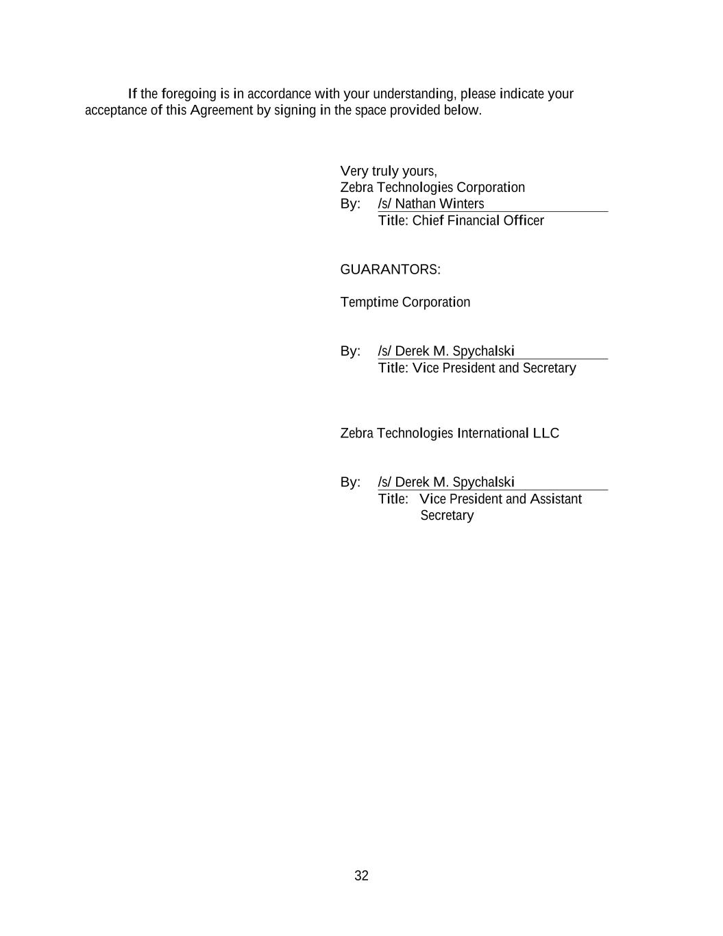 32 If the foregoing is in accordance with your understanding, please indicate your acceptance of this Agreement by signing in the space provided below. Very truly yours, Zebra Technologies Corporation By: /s/ Nathan Winters Title: Chief Financial Officer GUARANTORS: Temptime Corporation By: /s/ Derek M. Spychalski Title: Vice President and Secretary Zebra Technologies International LLC By: /s/ Derek M. Spychalski Title: Vice President and Assistant Secretary