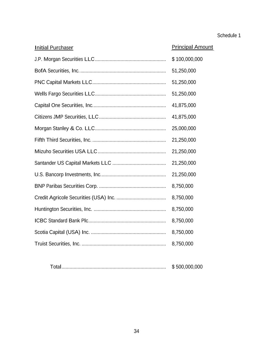 34 Schedule 1 Initial Purchaser Principal Amount J.P. Morgan Securities LLC ..................................................... $ 100,000,000 BofA Securities, Inc. ................................................................ 51,250,000 PNC Capital Markets LLC ....................................................... 51,250,000 Wells Fargo Securities LLC ..................................................... 51,250,000 Capital One Securities, Inc. ...................................................... 41,875,000 Citizens JMP Securities, LLC .................................................. 41,875,000 Morgan Stanley & Co. LLC ..................................................... 25,000,000 Fifth Third Securities, Inc. ....................................................... 21,250,000 Mizuho Securities USA LLC ................................................... 21,250,000 Santander US Capital Markets LLC ........................................ 21,250,000 U.S. Bancorp Investments, Inc. ................................................ 21,250,000 BNP Paribas Securities Corp. .................................................. 8,750,000 Credit Agricole Securities (USA) Inc. ..................................... 8,750,000 Huntington Securities, Inc. ...................................................... 8,750,000 ICBC Standard Bank Plc .......................................................... 8,750,000 Scotia Capital (USA) Inc. ........................................................ 8,750,000 Truist Securities, Inc. ............................................................... 8,750,000 Total .............................................................................. $ 500,000,000