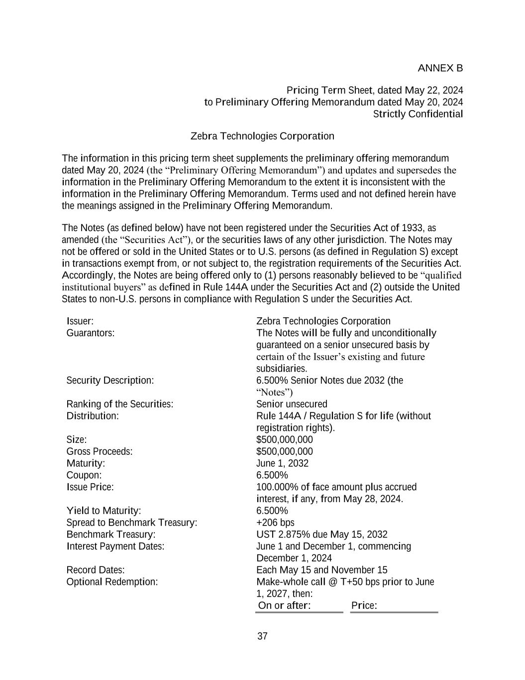 37 ANNEX B Pricing Term Sheet, dated May 22, 2024 to Preliminary Offering Memorandum dated May 20, 2024 Strictly Confidential Zebra Technologies Corporation The information in this pricing term sheet supplements the preliminary offering memorandum dated May 20, 2024 (the “Preliminary Offering Memorandum”) and updates and supersedes the information in the Preliminary Offering Memorandum to the extent it is inconsistent with the information in the Preliminary Offering Memorandum. Terms used and not defined herein have the meanings assigned in the Preliminary Offering Memorandum. The Notes (as defined below) have not been registered under the Securities Act of 1933, as amended (the “Securities Act”), or the securities laws of any other jurisdiction. The Notes may not be offered or sold in the United States or to U.S. persons (as defined in Regulation S) except in transactions exempt from, or not subject to, the registration requirements of the Securities Act. Accordingly, the Notes are being offered only to (1) persons reasonably believed to be “qualified institutional buyers” as defined in Rule 144A under the Securities Act and (2) outside the United States to non-U.S. persons in compliance with Regulation S under the Securities Act. Issuer: Zebra Technologies Corporation Guarantors: The Notes will be fully and unconditionally guaranteed on a senior unsecured basis by certain of the Issuer’s existing and future subsidiaries. Security Description: 6.500% Senior Notes due 2032 (the “Notes”) Ranking of the Securities: Senior unsecured Distribution: Rule 144A / Regulation S for life (without registration rights). Size: $500,000,000 Gross Proceeds: $500,000,000 Maturity: June 1, 2032 Coupon: 6.500% Issue Price: 100.000% of face amount plus accrued interest, if any, from May 28, 2024. Yield to Maturity: 6.500% Spread to Benchmark Treasury: +206 bps Benchmark Treasury: UST 2.875% due May 15, 2032 Interest Payment Dates: June 1 and December 1, commencing December 1, 2024 Record Dates: Each May 15 and November 15 Optional Redemption: Make-whole call @ T+50 bps prior to June 1, 2027, then: On or after: Price: