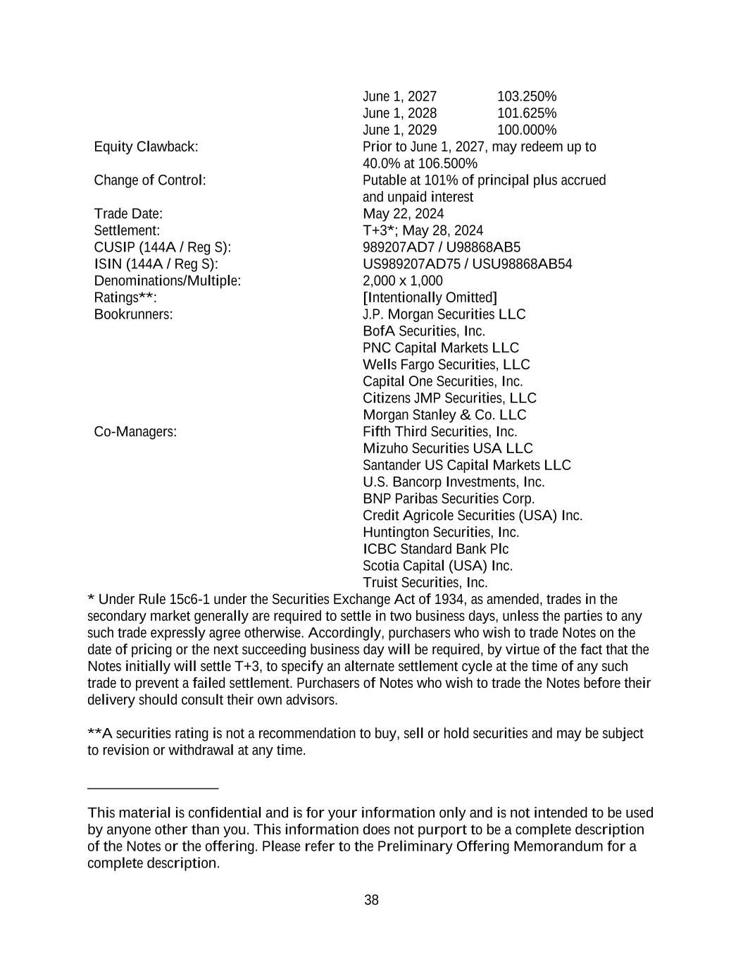 38 June 1, 2027 103.250% June 1, 2028 101.625% June 1, 2029 100.000% Equity Clawback: Prior to June 1, 2027, may redeem up to 40.0% at 106.500% Change of Control: Putable at 101% of principal plus accrued and unpaid interest Trade Date: May 22, 2024 Settlement: T+3*; May 28, 2024 CUSIP (144A / Reg S): 989207AD7 / U98868AB5 ISIN (144A / Reg S): US989207AD75 / USU98868AB54 Denominations/Multiple: 2,000 x 1,000 Ratings**: [Intentionally Omitted] Bookrunners: J.P. Morgan Securities LLC BofA Securities, Inc. PNC Capital Markets LLC Wells Fargo Securities, LLC Capital One Securities, Inc. Citizens JMP Securities, LLC Morgan Stanley & Co. LLC Co-Managers: Fifth Third Securities, Inc. Mizuho Securities USA LLC Santander US Capital Markets LLC U.S. Bancorp Investments, Inc. BNP Paribas Securities Corp. Credit Agricole Securities (USA) Inc. Huntington Securities, Inc. ICBC Standard Bank Plc Scotia Capital (USA) Inc. Truist Securities, Inc. * Under Rule 15c6-1 under the Securities Exchange Act of 1934, as amended, trades in the secondary market generally are required to settle in two business days, unless the parties to any such trade expressly agree otherwise. Accordingly, purchasers who wish to trade Notes on the date of pricing or the next succeeding business day will be required, by virtue of the fact that the Notes initially will settle T+3, to specify an alternate settlement cycle at the time of any such trade to prevent a failed settlement. Purchasers of Notes who wish to trade the Notes before their delivery should consult their own advisors. **A securities rating is not a recommendation to buy, sell or hold securities and may be subject to revision or withdrawal at any time. __________________ This material is confidential and is for your information only and is not intended to be used by anyone other than you. This information does not purport to be a complete description of the Notes or the offering. Please refer to the Preliminary Offering Memorandum for a complete description.
